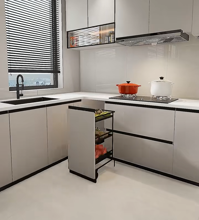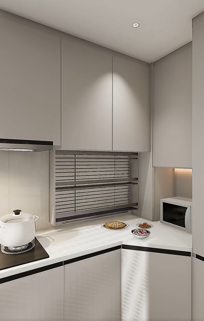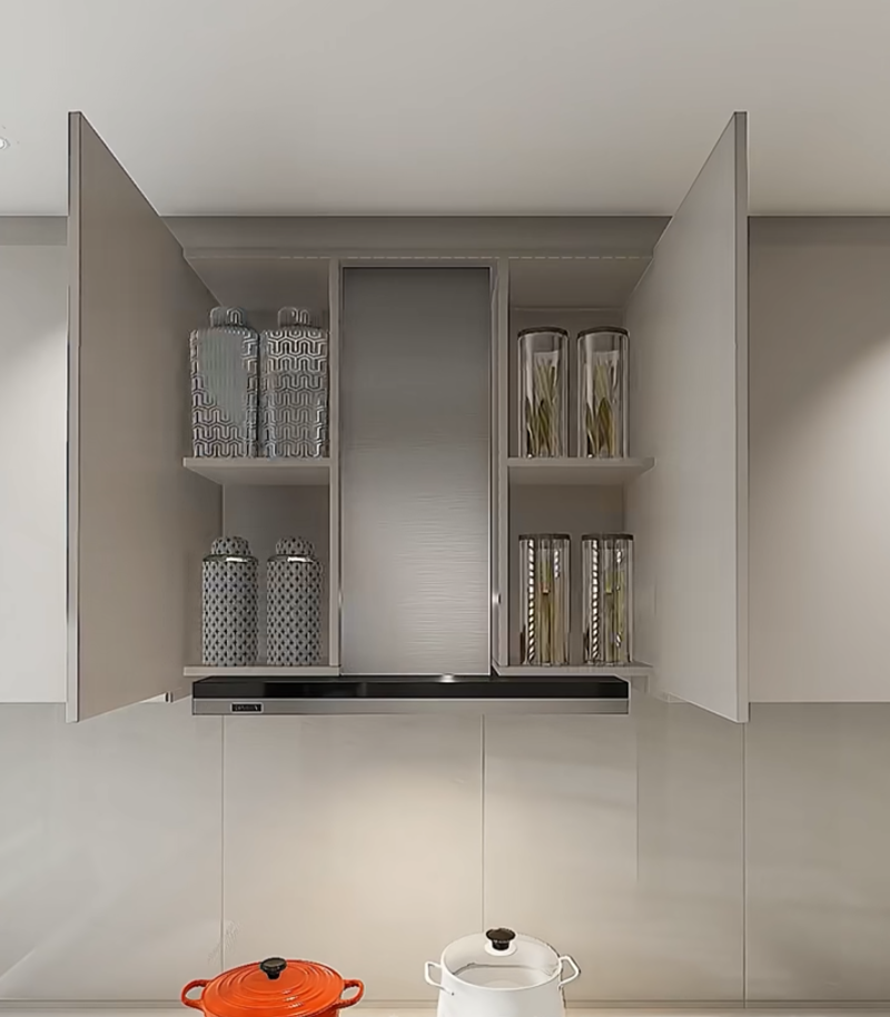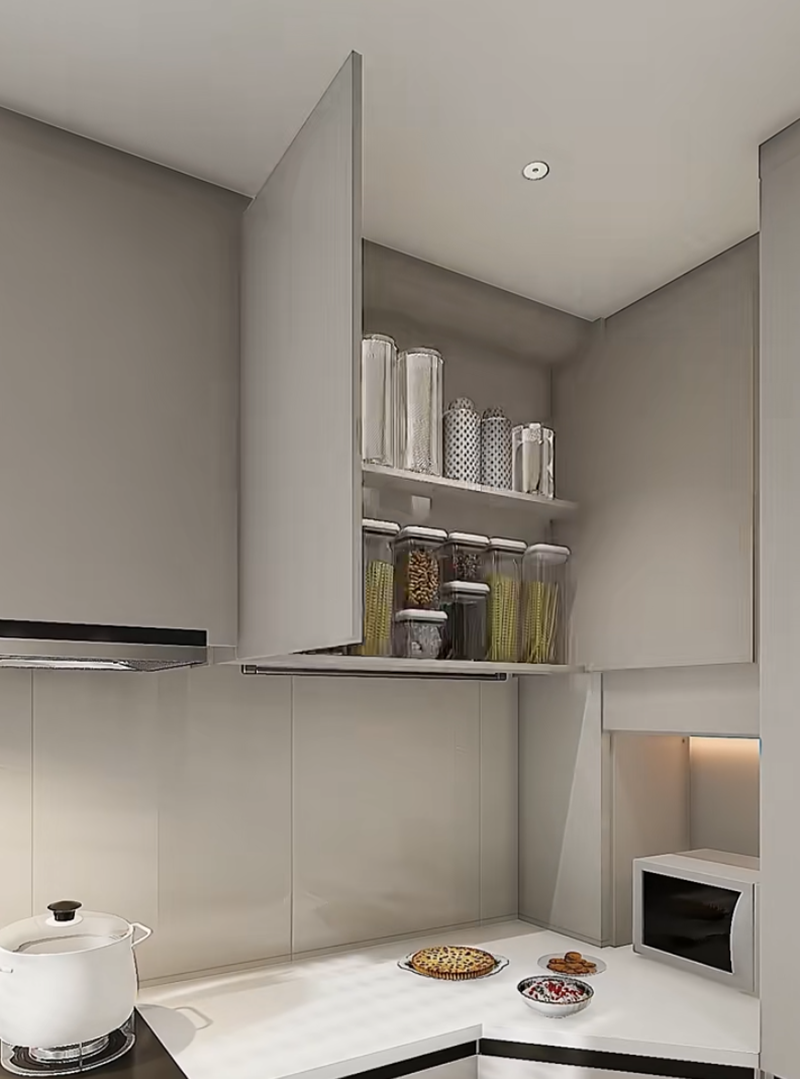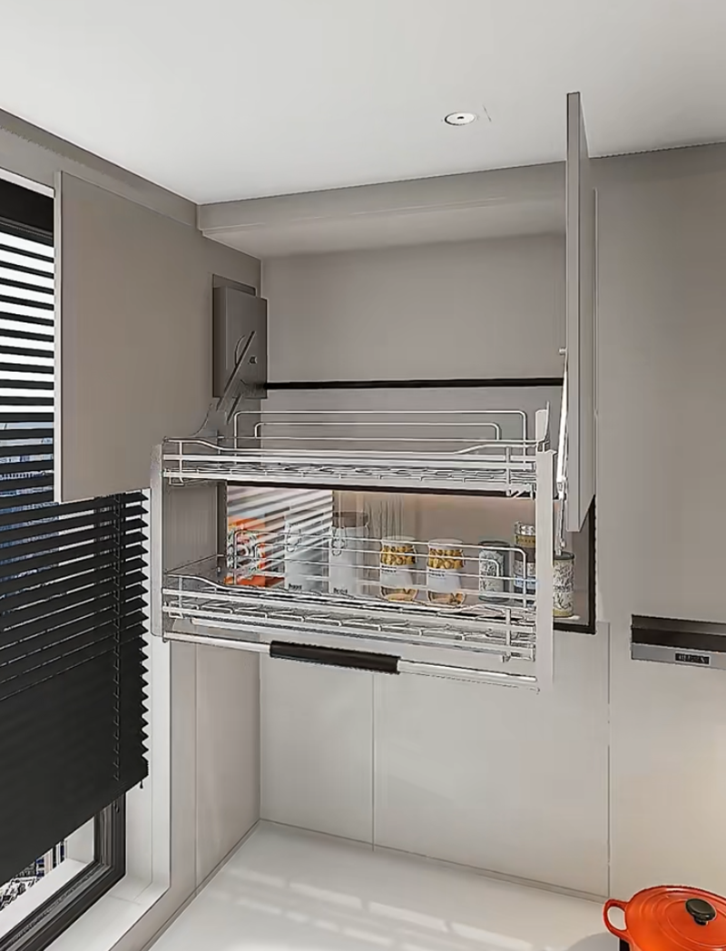 استبدل الخزائن المعلقة التقليدية بـ سلال رافعة ، مع وجود سلال شبكيّة متعددة الطبقات في الداخل. اضغط على المقبض بلطف، وستنخفض السلة تدريجيًا إلى مستوى ارتفاع الصدر. يمكن بسهولة أخذ زيوت، أملاح، صلصات، خلّ، وعلب، ولا داعِ بعد الآن للوقوف على أطراف الأصابع أو استخدام الكراسي، مما يجعلها مناسبة جدًا للأشخاص ذوي القامة القصيرة وكبار السن.