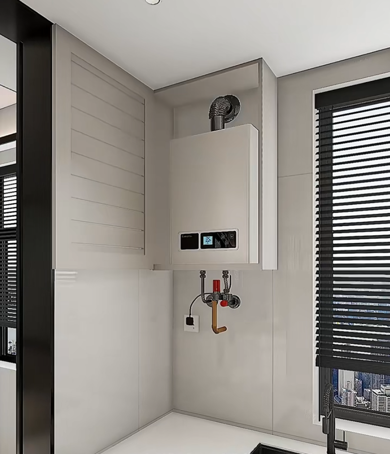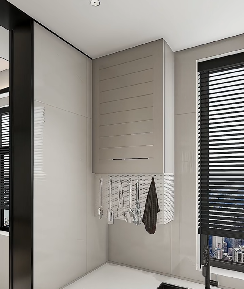 اصنع خزانة فائقة الرقة (بسمك 12 سم) لإغلاق السخان المائي وتغطية المواسير وجعل المظهر أكثر جمالاً. قم بتركيب لوحة مثقبة في الأسفل لتعليق أدوات المطبخ مثل الملاعق والملعقات، ويمكن الوصول إليها بسهولة أثناء الطهي. إنها أكثر نظافة من التعليق على الحائط، كما تساعد أيضًا في منع أدوات المطبخ من الصدأ.