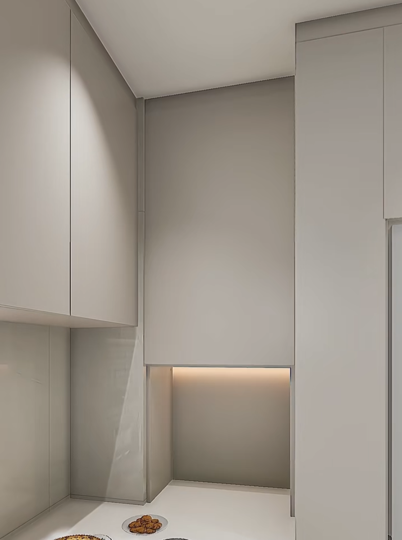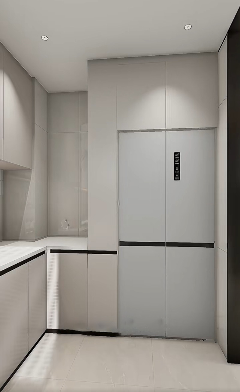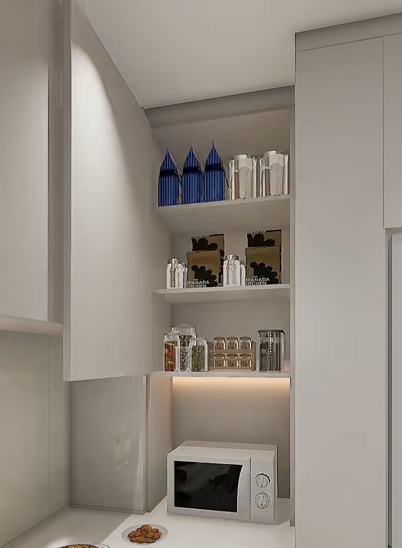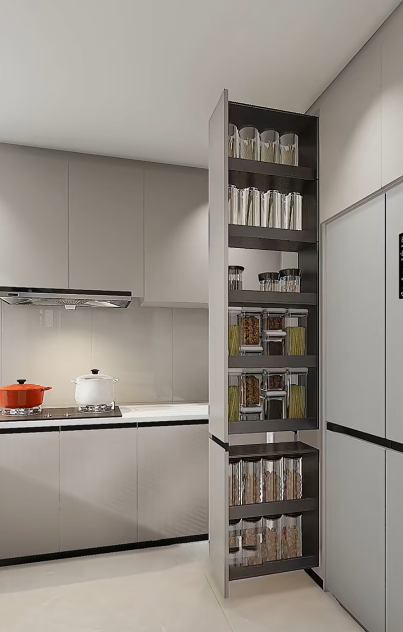 صمم خزانة جانبية ضيقة قابلة للسحب (حوالي 25 سم عرضًا) بجانب الثلاجة. قم بإنشاء أقسام متعددة داخلها لحفظ التوابل المستخدمة بشكل شائع مثل صلصة الصويا والخل. عمق الخزانة المنزلقة هو نفس عمق الثلاجة، وهي غير مرئية تمامًا عند إغلاق الباب. عند الطهي، يمكنك سحب التوابل بسهولة، وهي أسرع بـ 10 مرات من البحث في الخزائن.