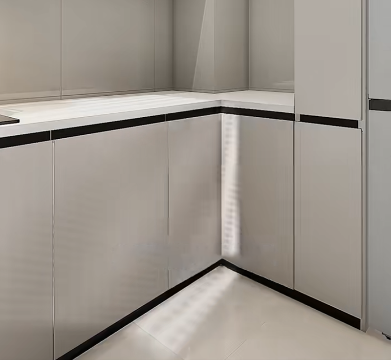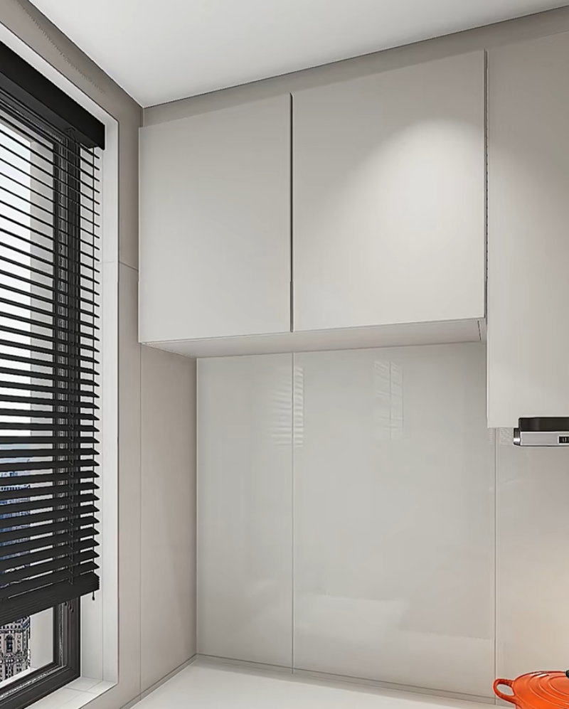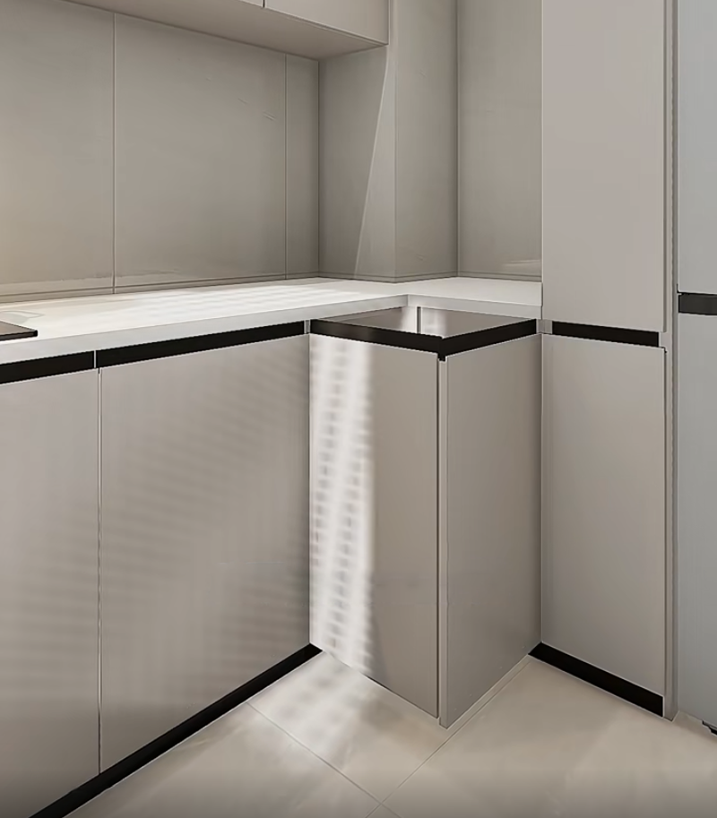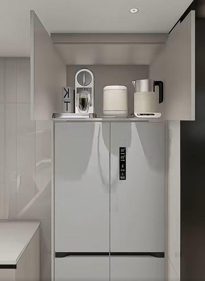 صمم خزانة جانبية ضيقة قابلة للسحب (حوالي 25 سم عرضًا) بجانب الثلاجة. قم بإنشاء أقسام متعددة داخلها لحفظ التوابل المستخدمة بشكل شائع مثل صلصة الصويا والخل. عمق الخزانة المنزلقة هو نفس عمق الثلاجة، وهي غير مرئية تمامًا عند إغلاق الباب. عند الطهي، يمكنك سحب التوابل بسهولة، وهي أسرع بـ 10 مرات من البحث في الخزائن.