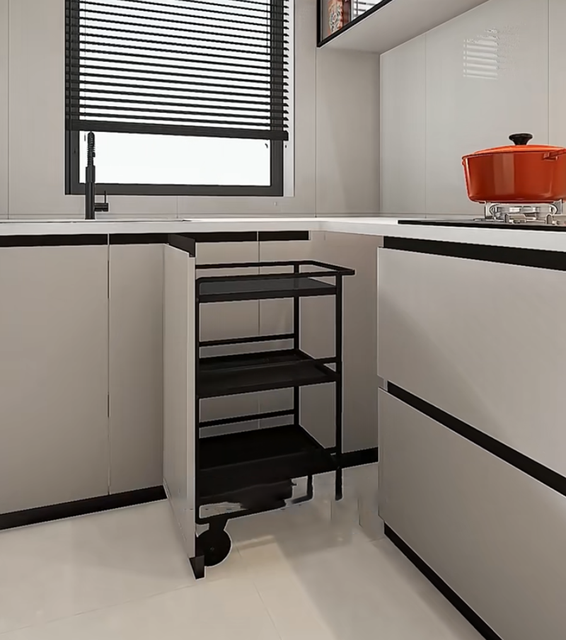 اترك مساحة في زاوية الخزانة السفلية وضع عربة متحركة . احفظ الخضروات مثل البطاطس والجزر بشكل طبقي. يتيح تصميم السلة الشبكية التهوية ويمنع تعرُّض الخضروات للحرارة والاختناق. تحتوي العربة على عجلات دوارة ويمكن سحبها مباشرة إلى الحوض عند غسل الخضروات، مما يجعلها أكثر تنظيمًا بكثير من تراكمها على سطح الطاولة.