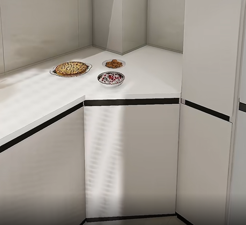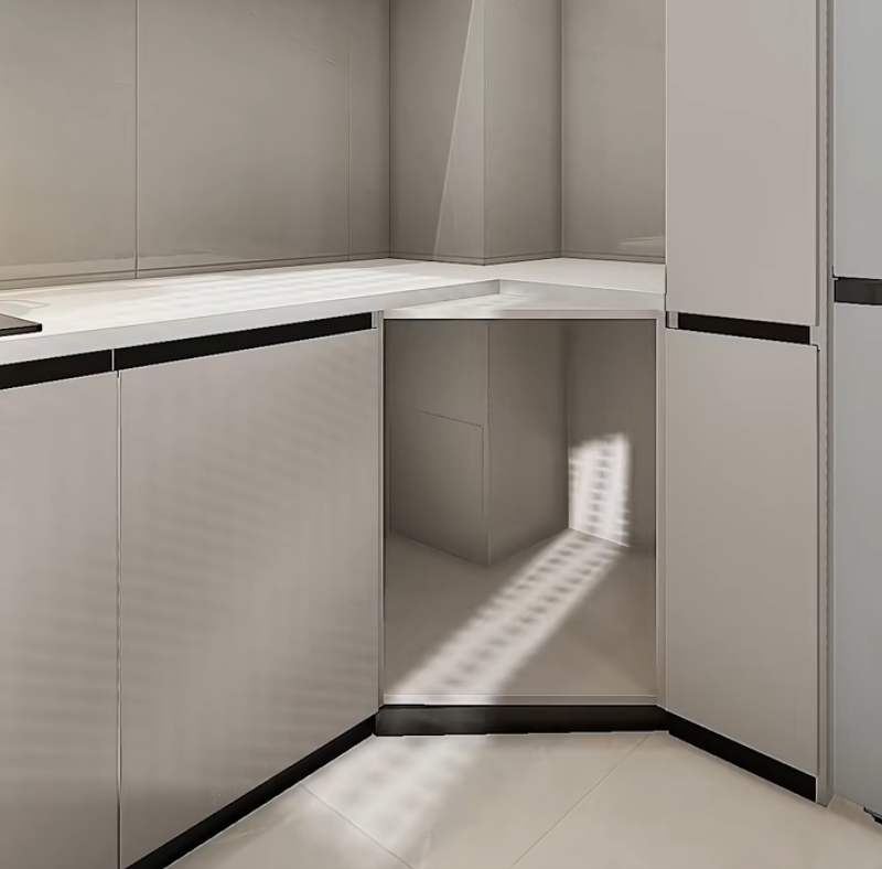 تخلَّ عن الخزائن التقليدية ذات الزوايا القائمة وقم بصنع خزانة زاوية على شكل معين . الباب مائل الحواف، وعند فتحه يُكشف الفضاء الداخلي بالكامل، مما يمكنه من استيعاب براميل الزيت الكبيرة وأكياس الأرز بسهولة. كما يمكن تمديد سطح المنضدة إلى "بار صغير"، وهو مريح جدًا لوضع صواني الخبز والبيتزا مؤقتًا، ويمكنه احتواء أكثر بنسبة 30٪ من الخزائن الزاوية العادية.