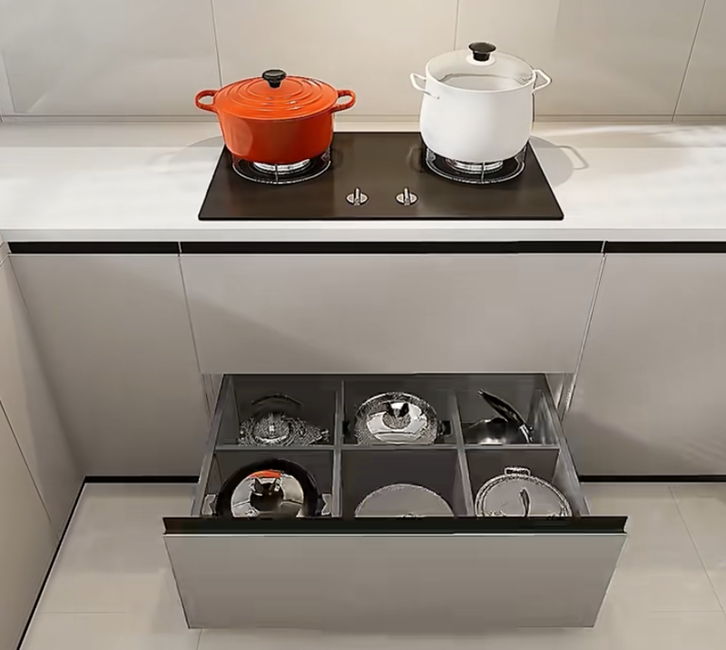 لا تصنع صفائح للخزانة السفلية، واستبدلها جميعًا ب أدراج كبيرة . استخدم صناديق مقسمة في المستوى العلوي لوضع عيدان الأكل والسكاكين والشوك، وضِع الأطباق والأواني على المستوى السفلي. يتم تخصيص داخل الدرج حسب حجم العناصر. عند إغلاق الباب، فإنه يعزل البقع الزيتية تمامًا، وهو أنظف بعشر مرات مقارنة بالرفوف المفتوحة، ولا حاجة للبحث بصعوبة عن الأشياء.
