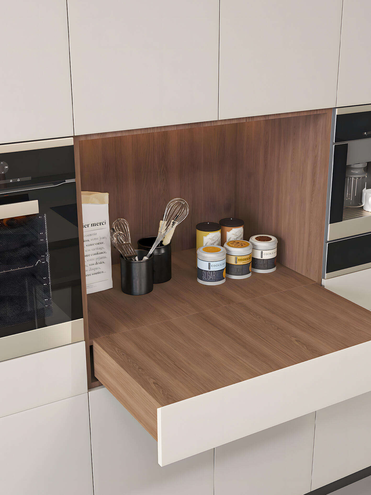 機能的カスタマイズ: 引き出し式スパイスラック、LEDのキャビネット下照明、隠し収納ボックスなどの機能を追加して、日常の使い勝手に合わせた設計が可能です。