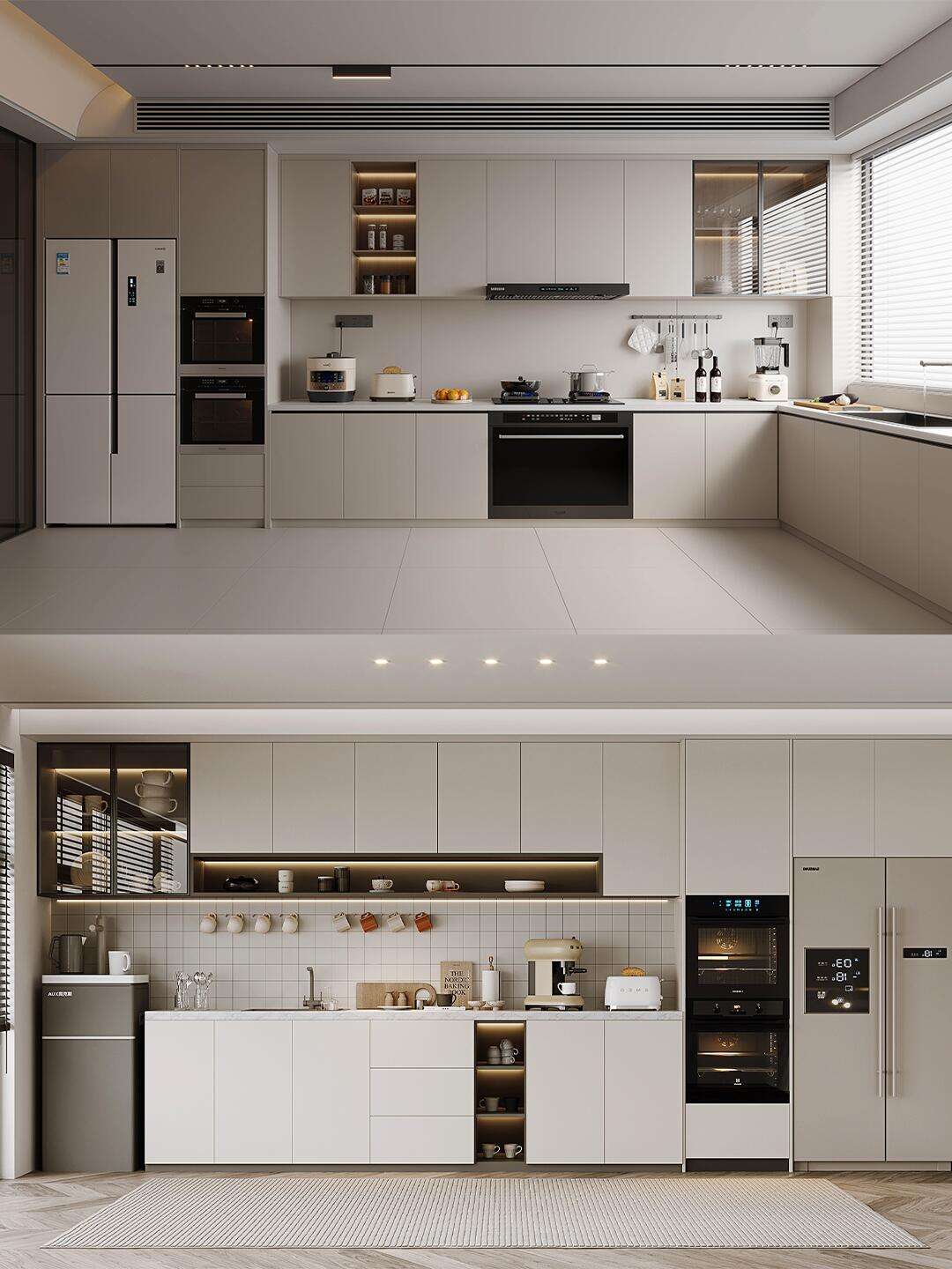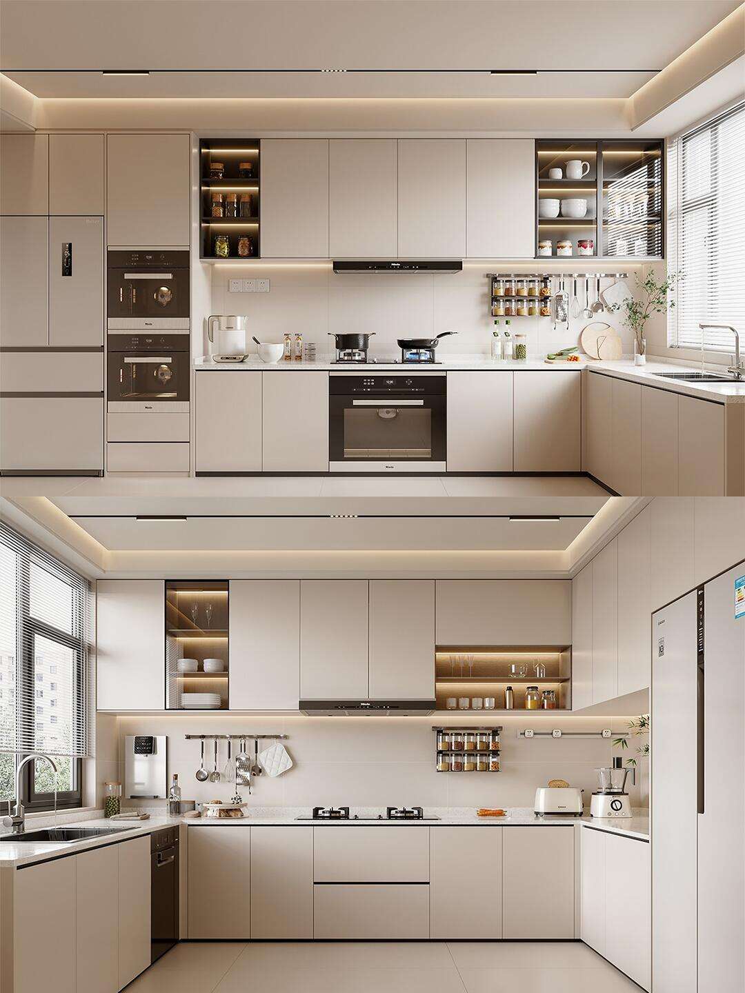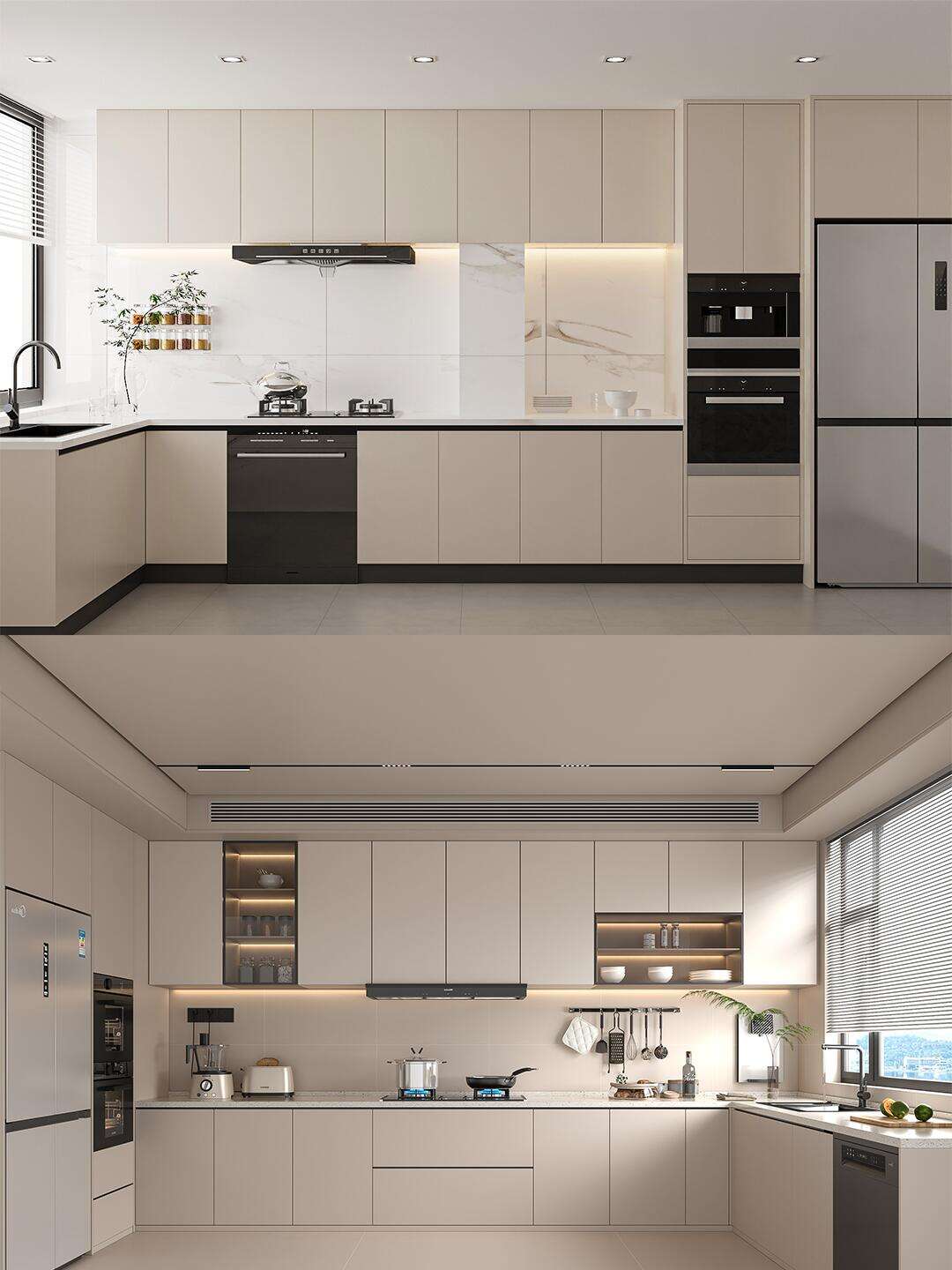 ニュートラルカラーと一体型家電を備えたモダン・ミニマリストキッチンキャビネットコレクション