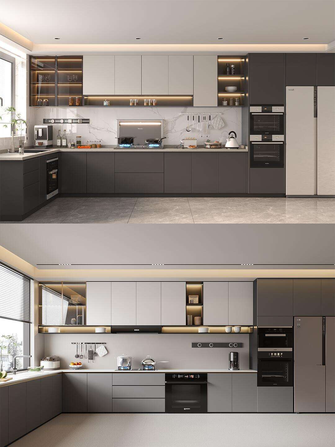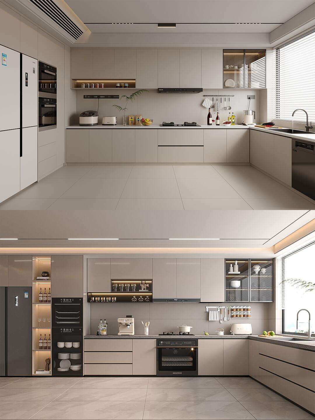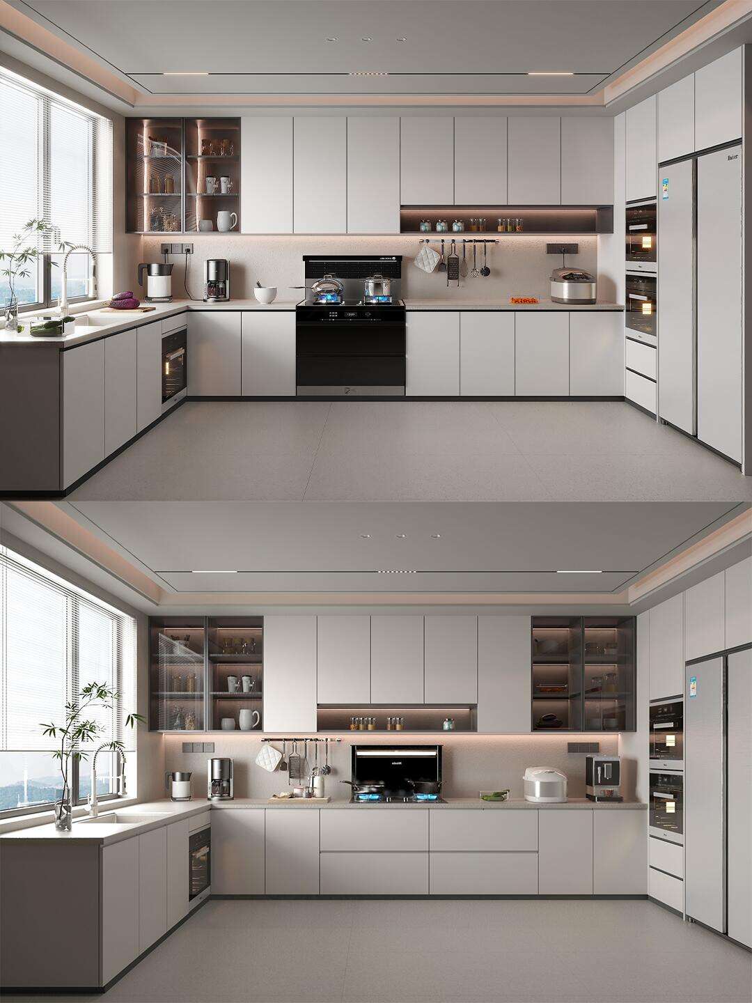 ニュートラルカラーと一体型家電を備えたモダン・ミニマリストキッチンキャビネットコレクション