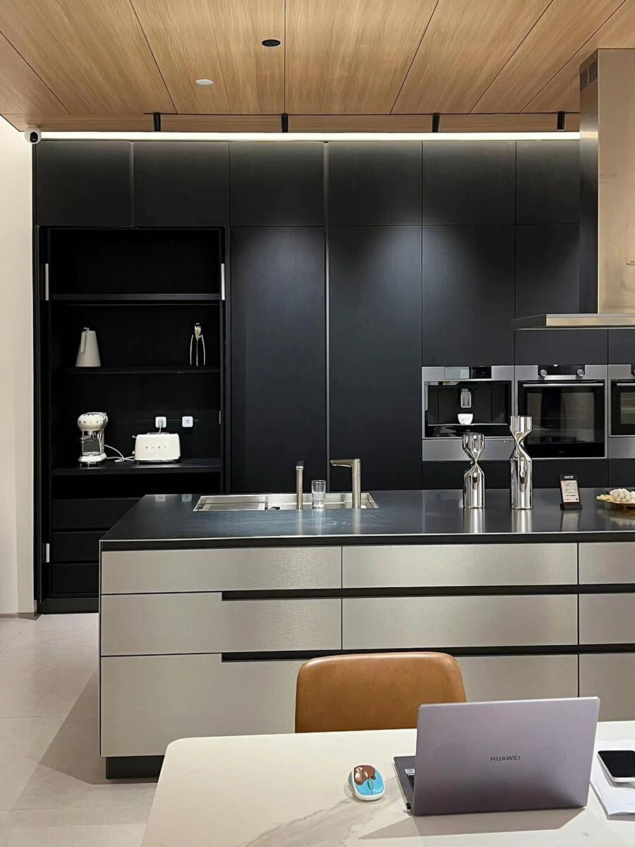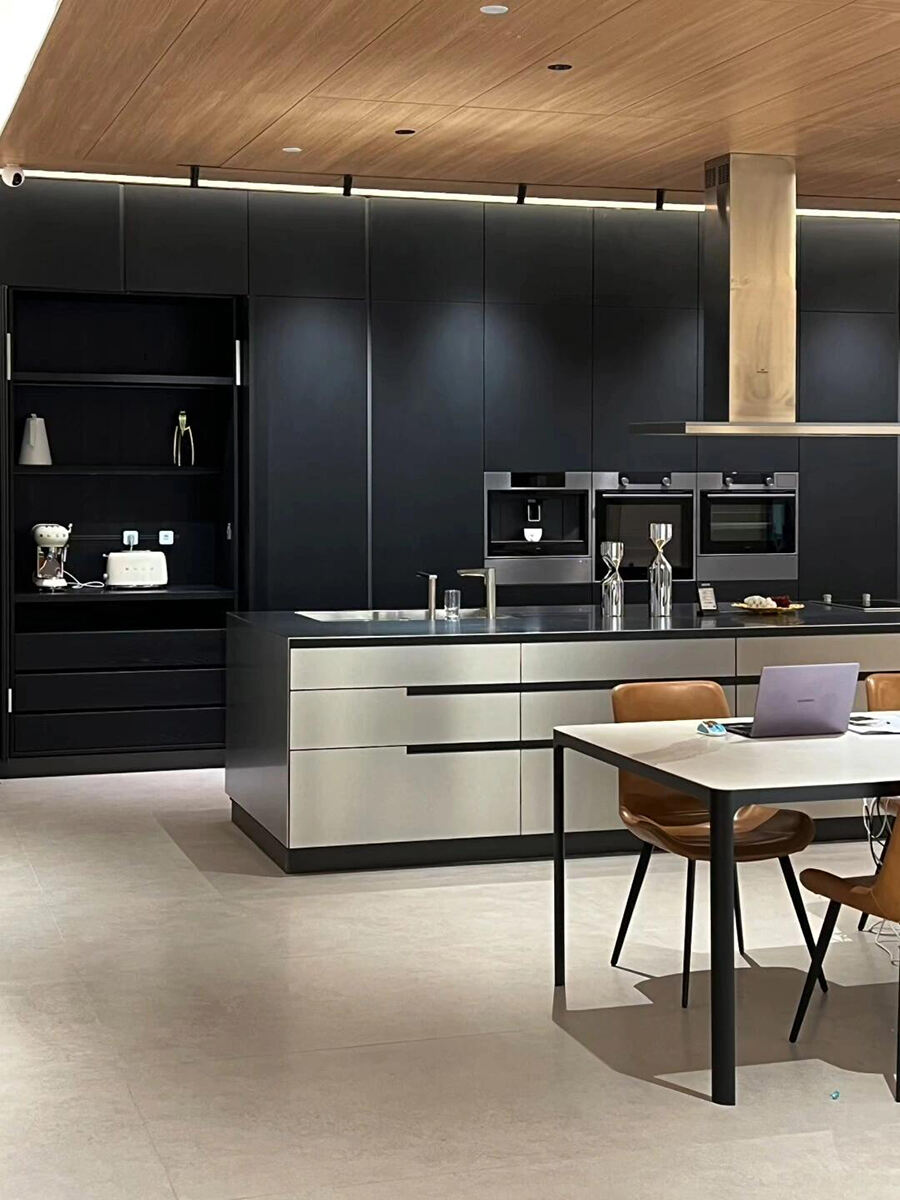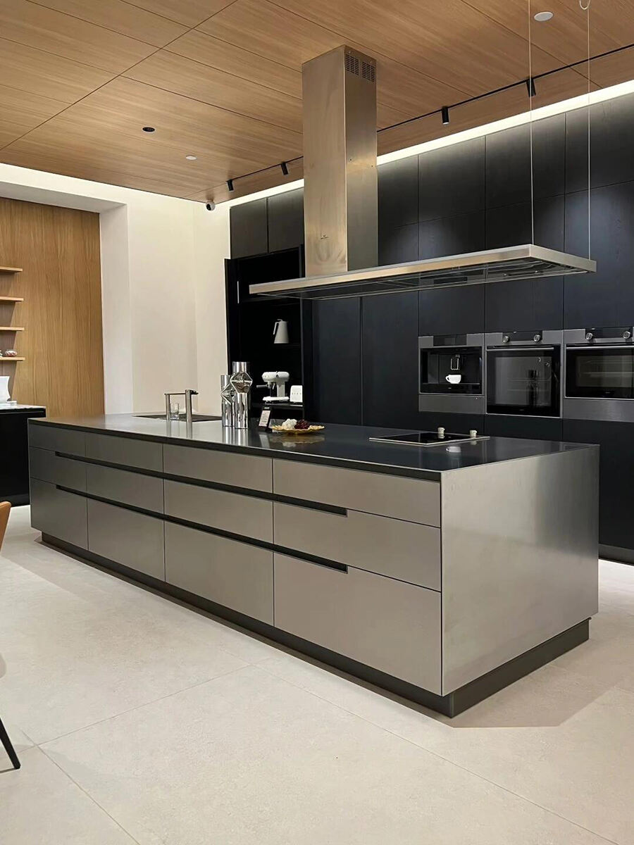 洗練されたブラックのアクセントを備えたモダンなステンレススチール製キッチンキャビネットで、キッチンをアップグレードしましょう。コンテンポラリーなキッチン空間に高級感を与えるデザインです。これらのプレミアムキャビネットはスタイリッシュな美観だけでなく、非常に実用的な収納機能も提供します。現代的なキッチン家電とのシームレスな統合、ステンレススチールの耐久性とブラック素材のエレガンスが融合しており、豪華さと実用性を求める方々にとって理想的な選択です。