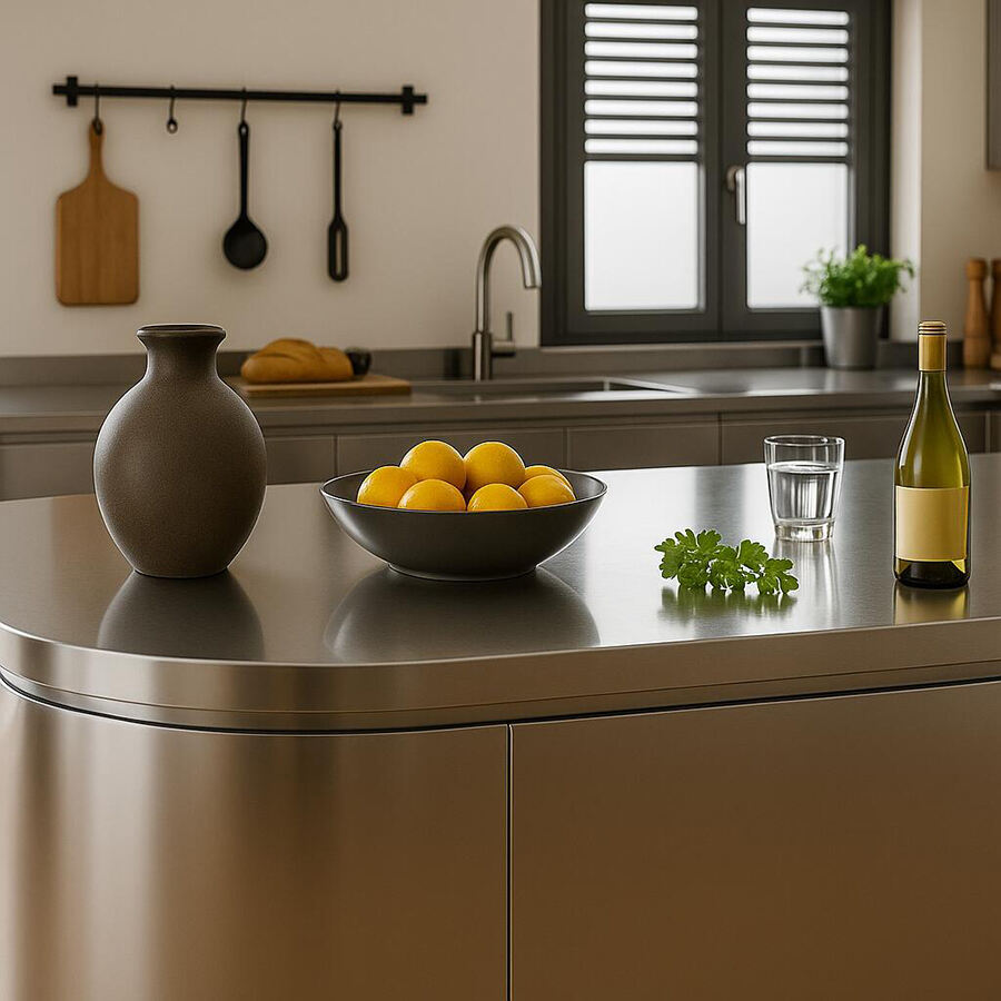 コンテンポラリーなキッチン向け、曲線形アイランド付きの洗練されたモダンなステンレススチール製キッチンキャビネット