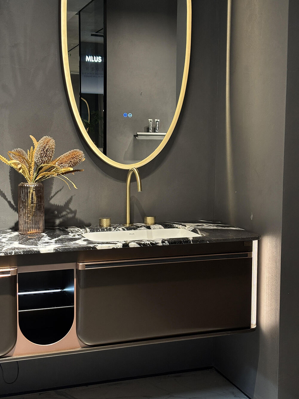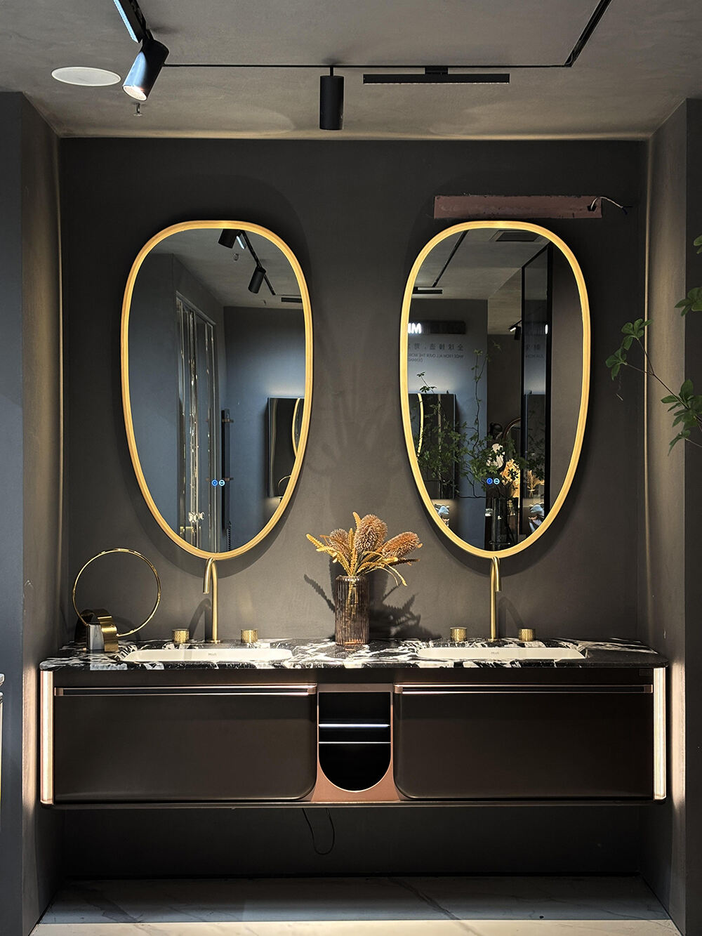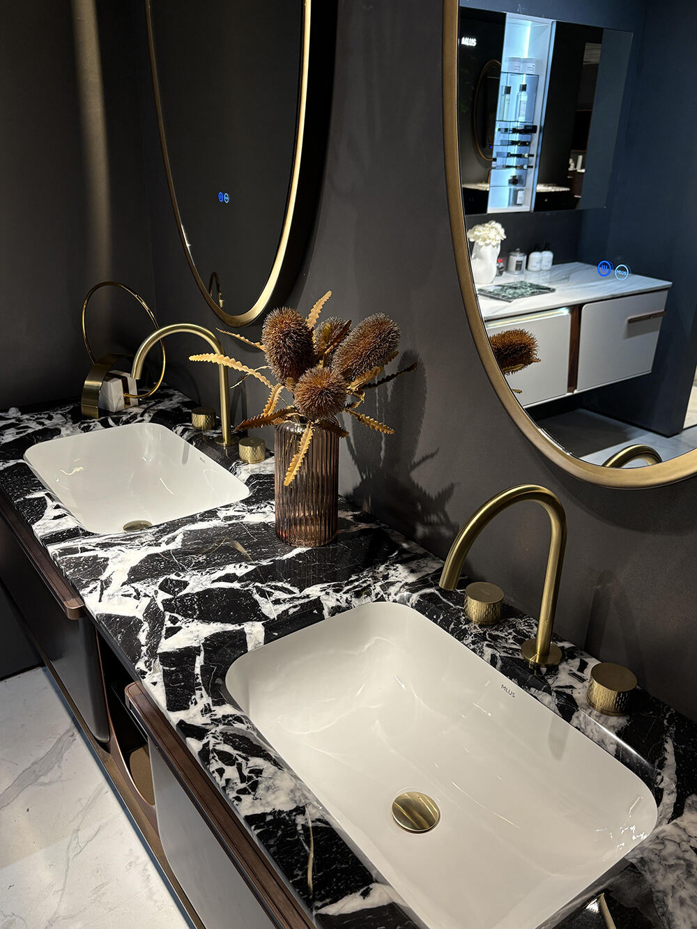 Elevate your hotel bathroom with this luxury vanity, featuring a black marble countertop, gold - accented oval mirrors, and modern storage. This elegant, high - end solution creates a sophisticated bathroom space.