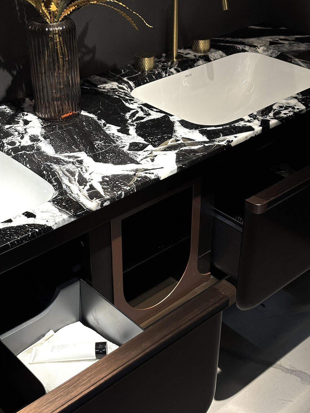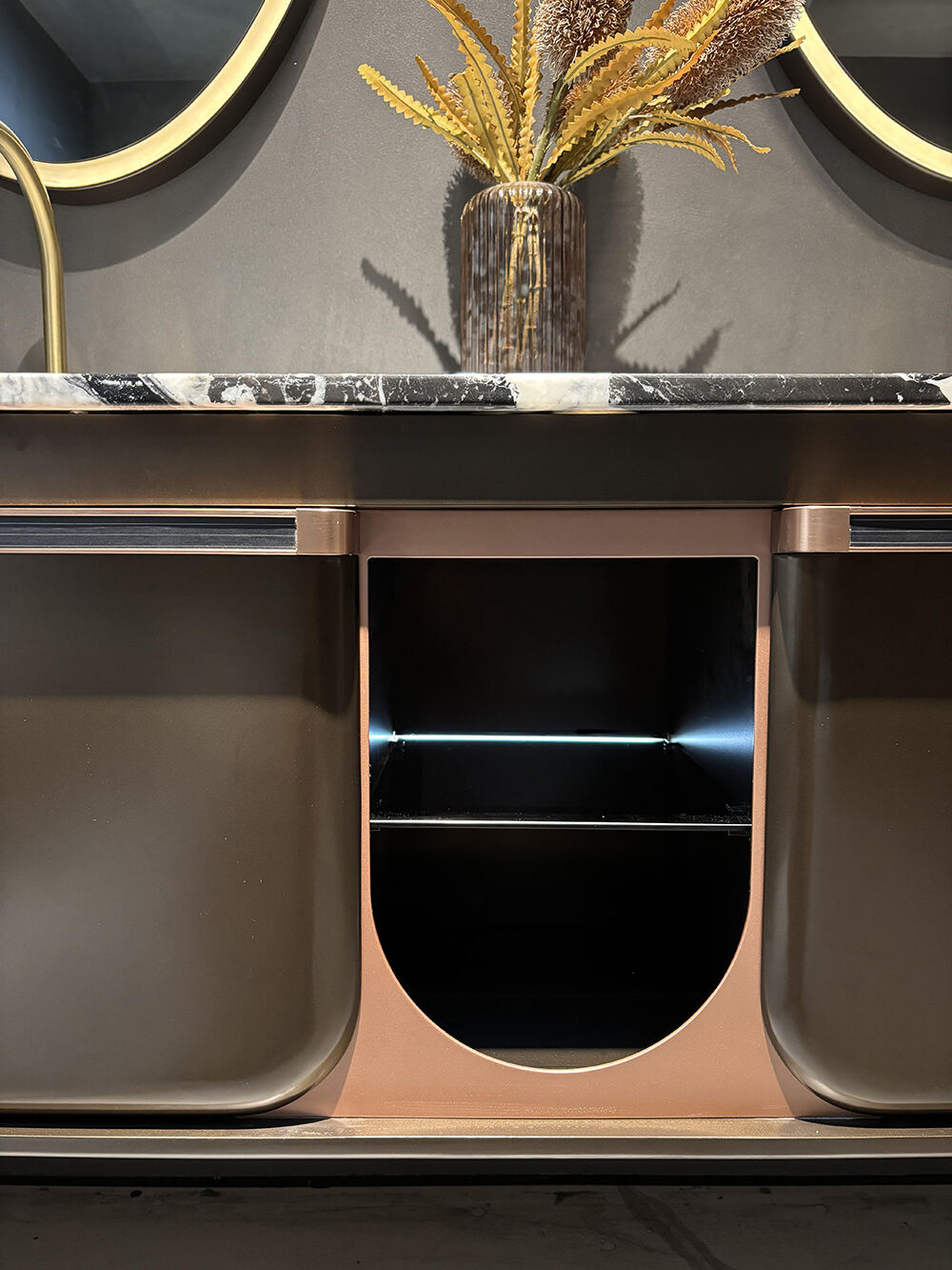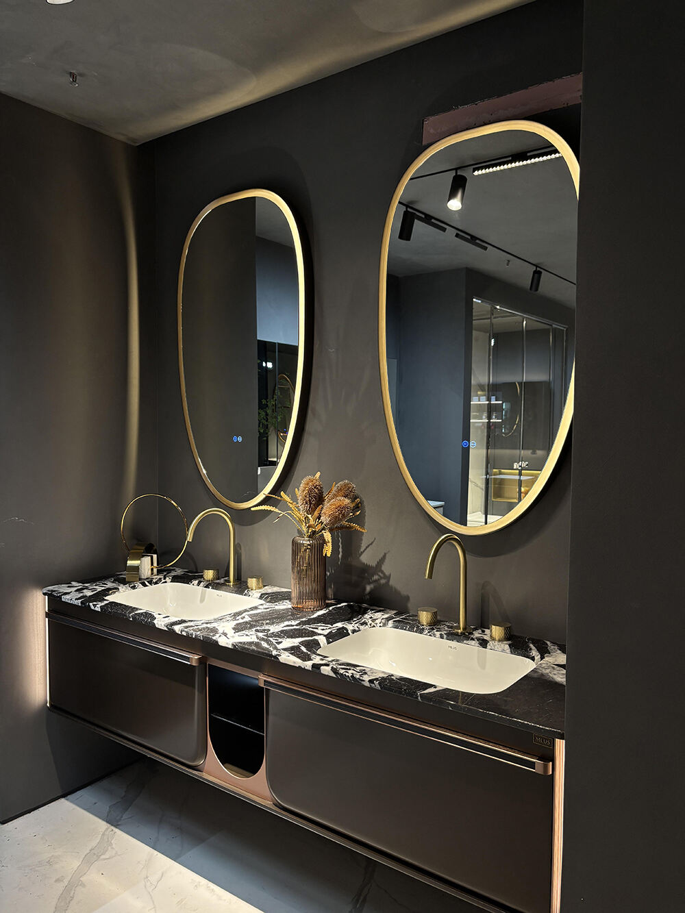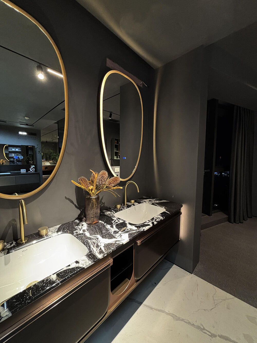 luxury hotel bathroom vanity with black marble countertop gold   accented oval mirrors and modern storage for a sophisticated bathroom space-9