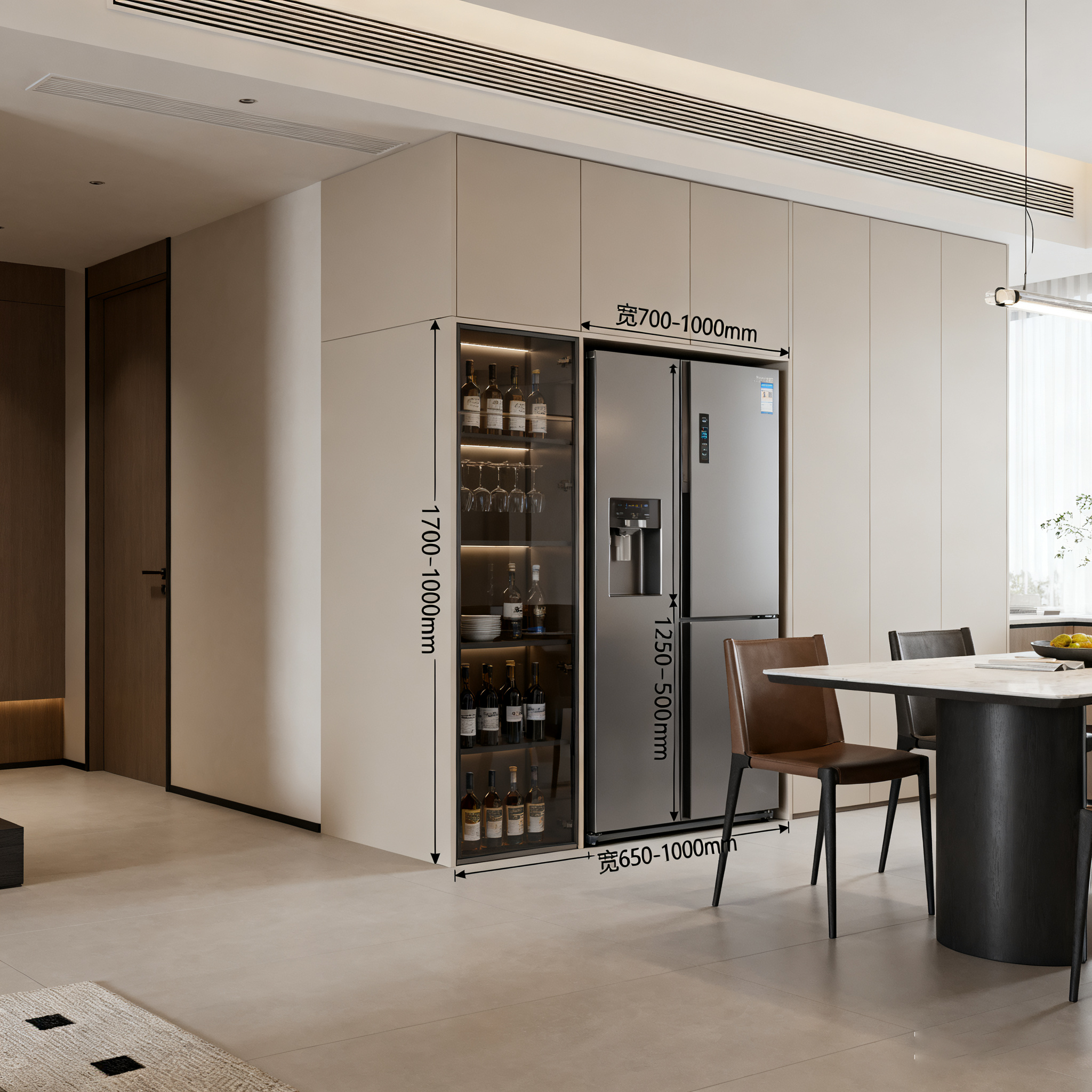- Суудлын өрөөнд байрлуулах : Ихэвчлэн хооллох өрөөний нэгэн буланд эсвэл суудлын өрөө ба хооллох өрөөний хооронд байрлуулдаг. Хооллох өрөөнд байрлуулах тохиолдолд тусдаа буланд эсвэл винийн шүүгээтэй хамт интеграци хийж болно. Төлөвлөх үед хөргөгчийг "далд" байрлуулбал илүү сайн харагдана. Хамгийн тохиромжтой нь шүүгээний зузаан хөргөгчийн зузаантай ижил байх явдал юм. Хэрэв таны төсөв зөвшөөрвөл, суурьтаж суугаа хөргөгч ашиглахыг зөвлөж байна. Хөргөгчийн хаалга нь шүүгээтэй ижил өнгөтэй, материалтай байвал нэг цогц байдлын мэдрэмжийг илүү их бий болгоно.