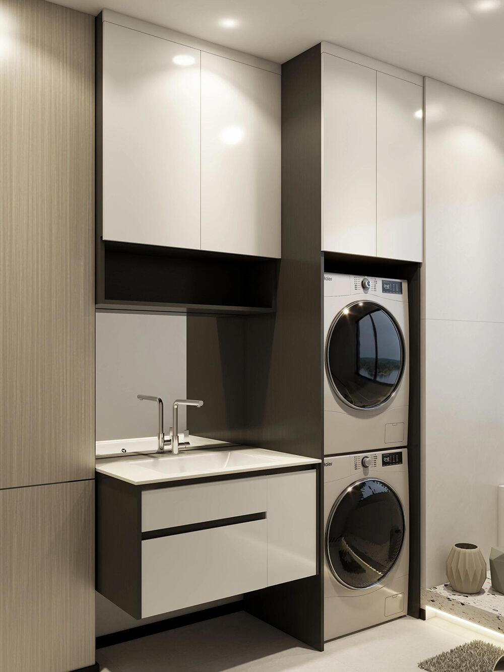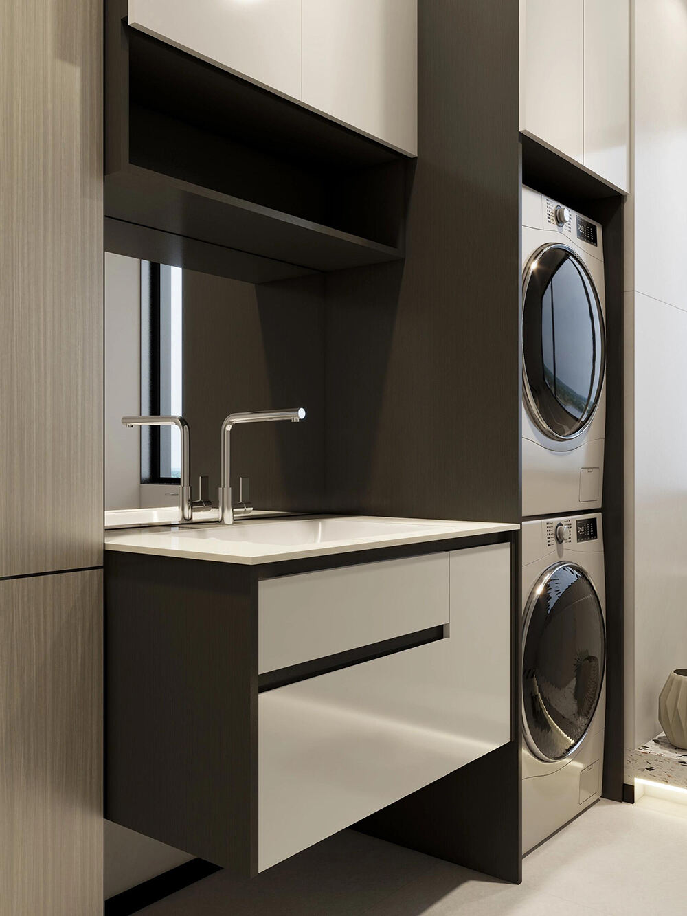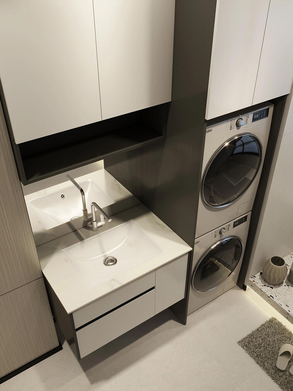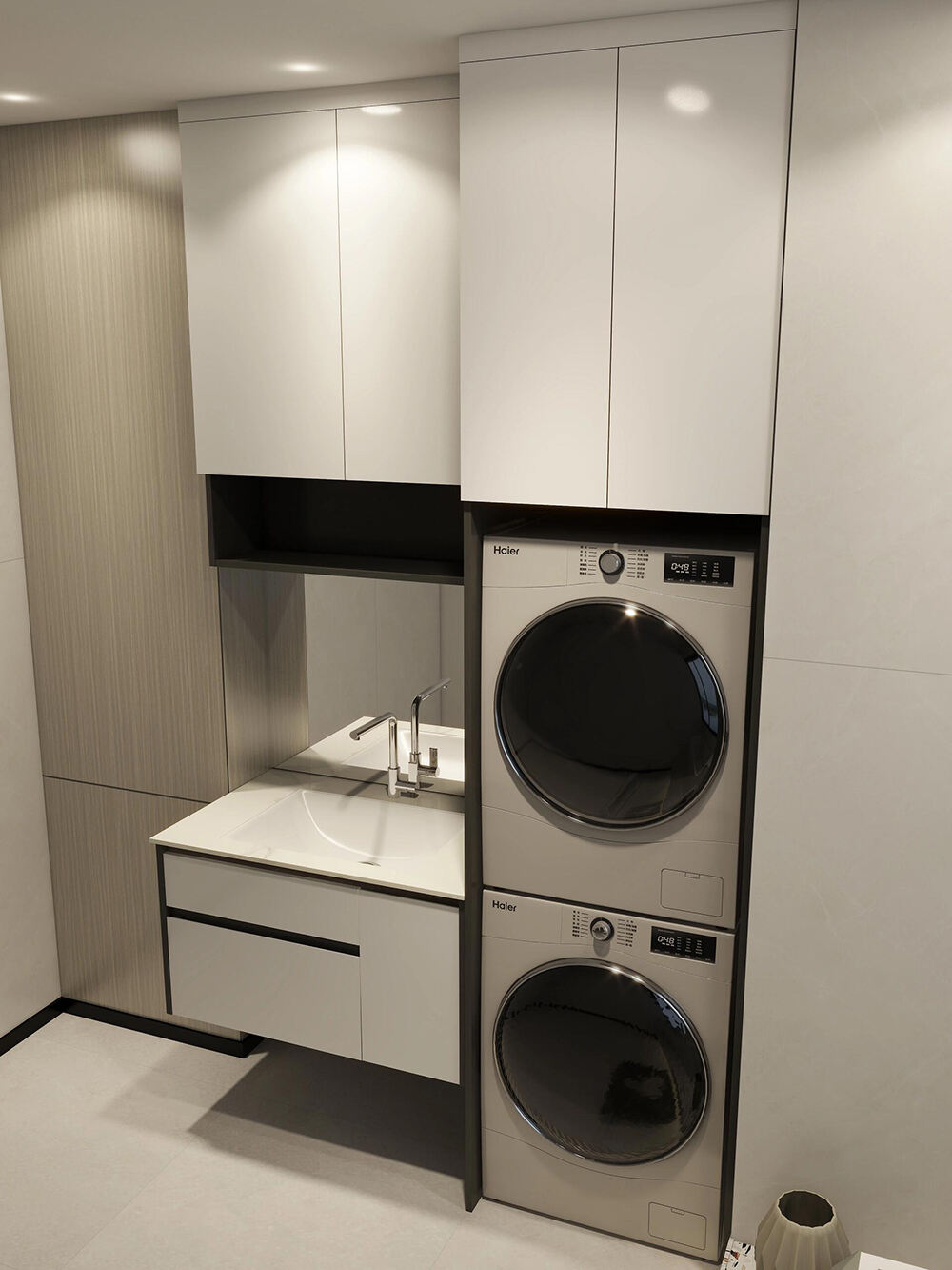 。Laundry Area: Precisely reserved space for washing machines/dryers, with height adapted to mainstream models. A maintenance space is left at the bottom for easy upkeep.