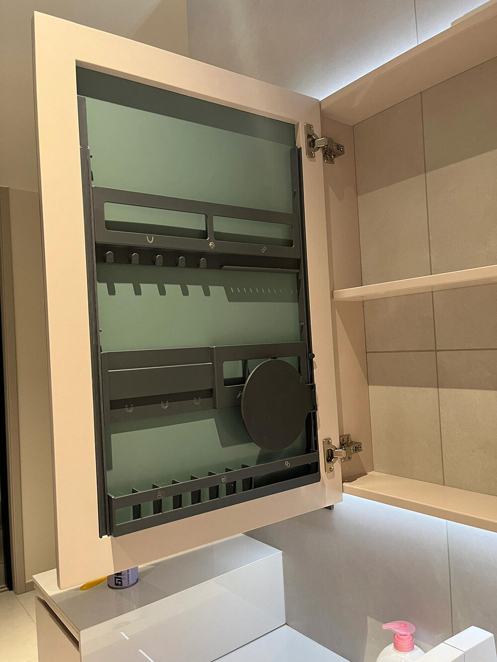 modern light beige bathroom vanity with multi   layered storage functional organizers and led   lit mirror for a tidy bathroom space-9