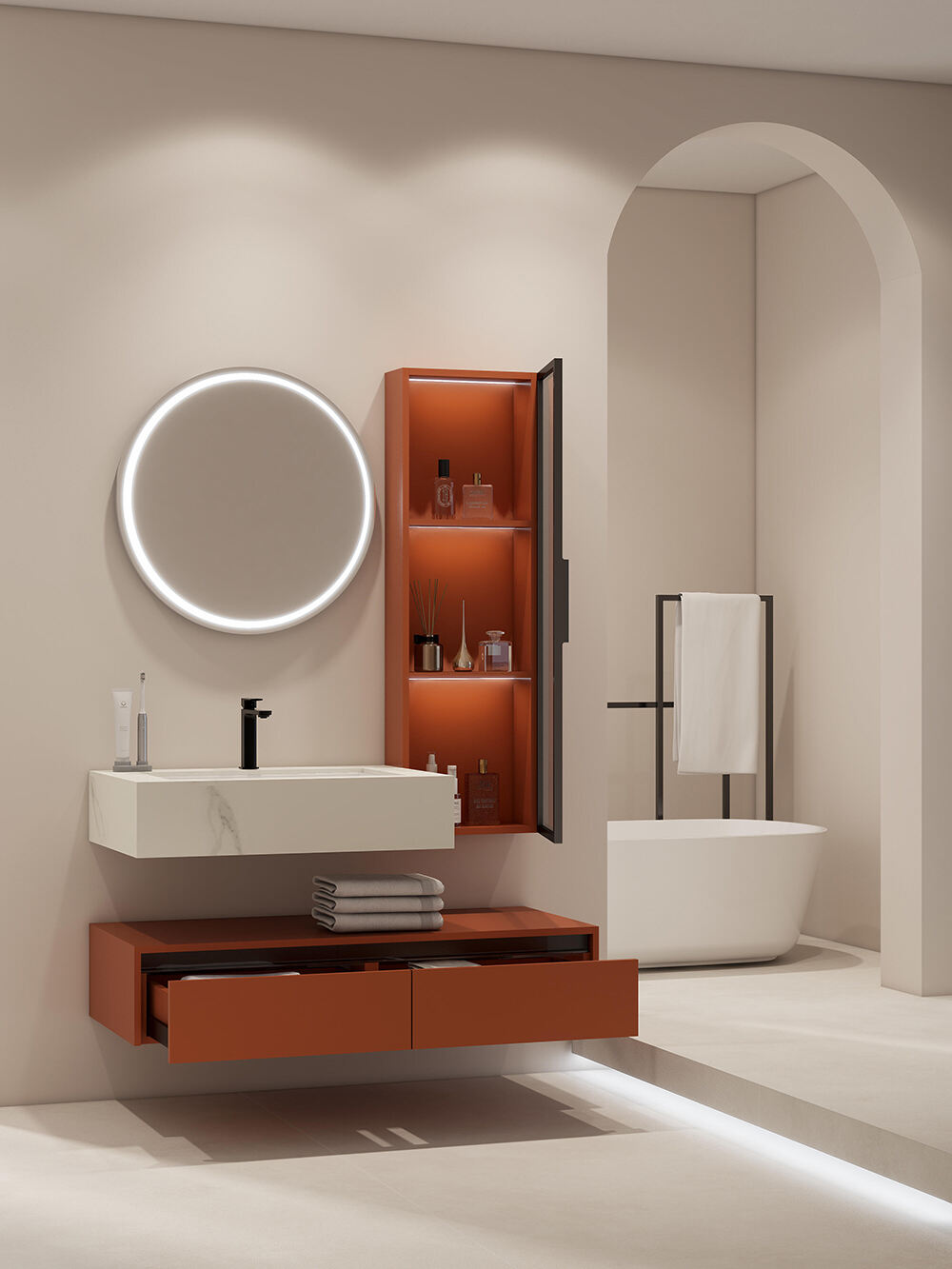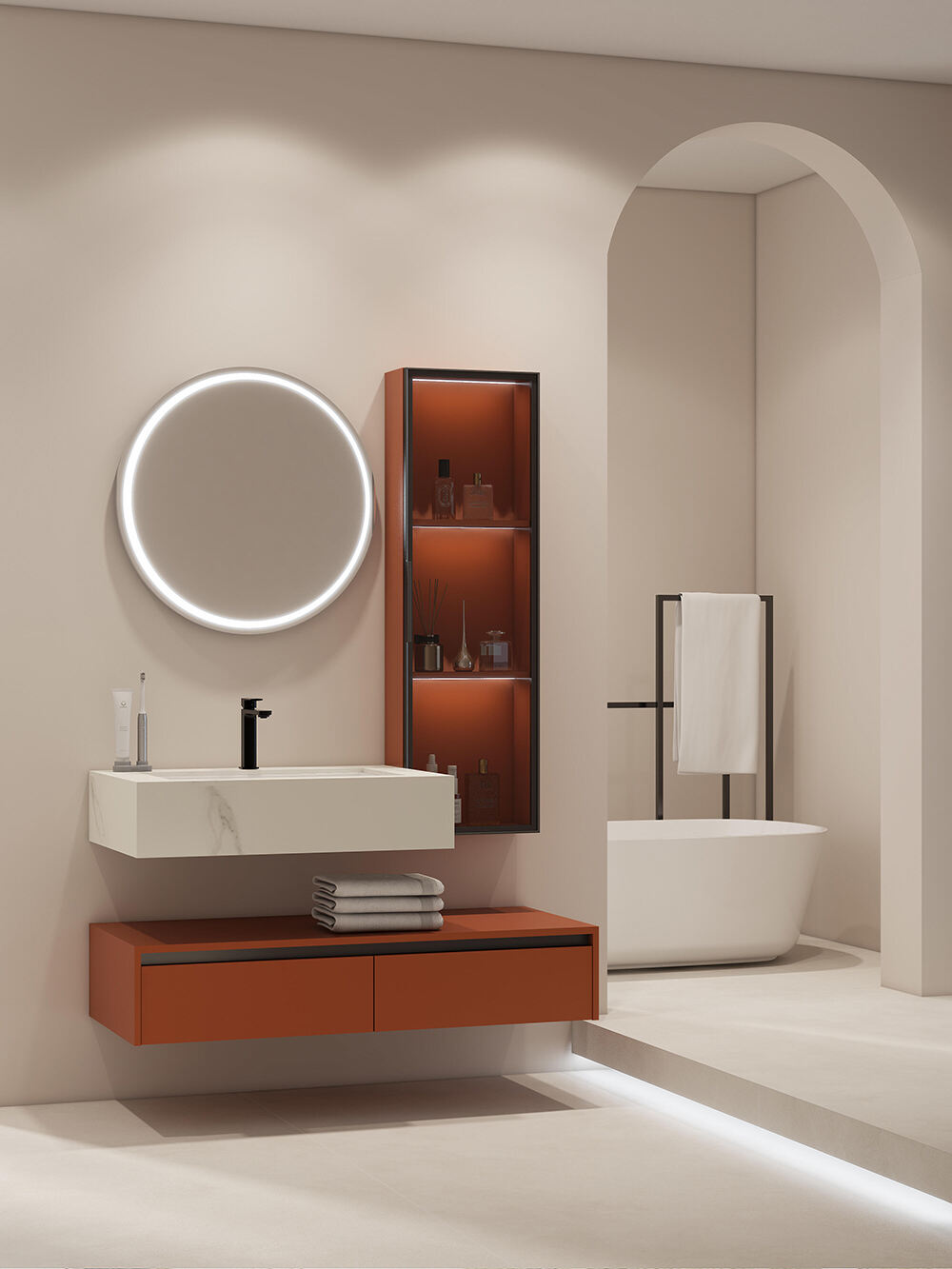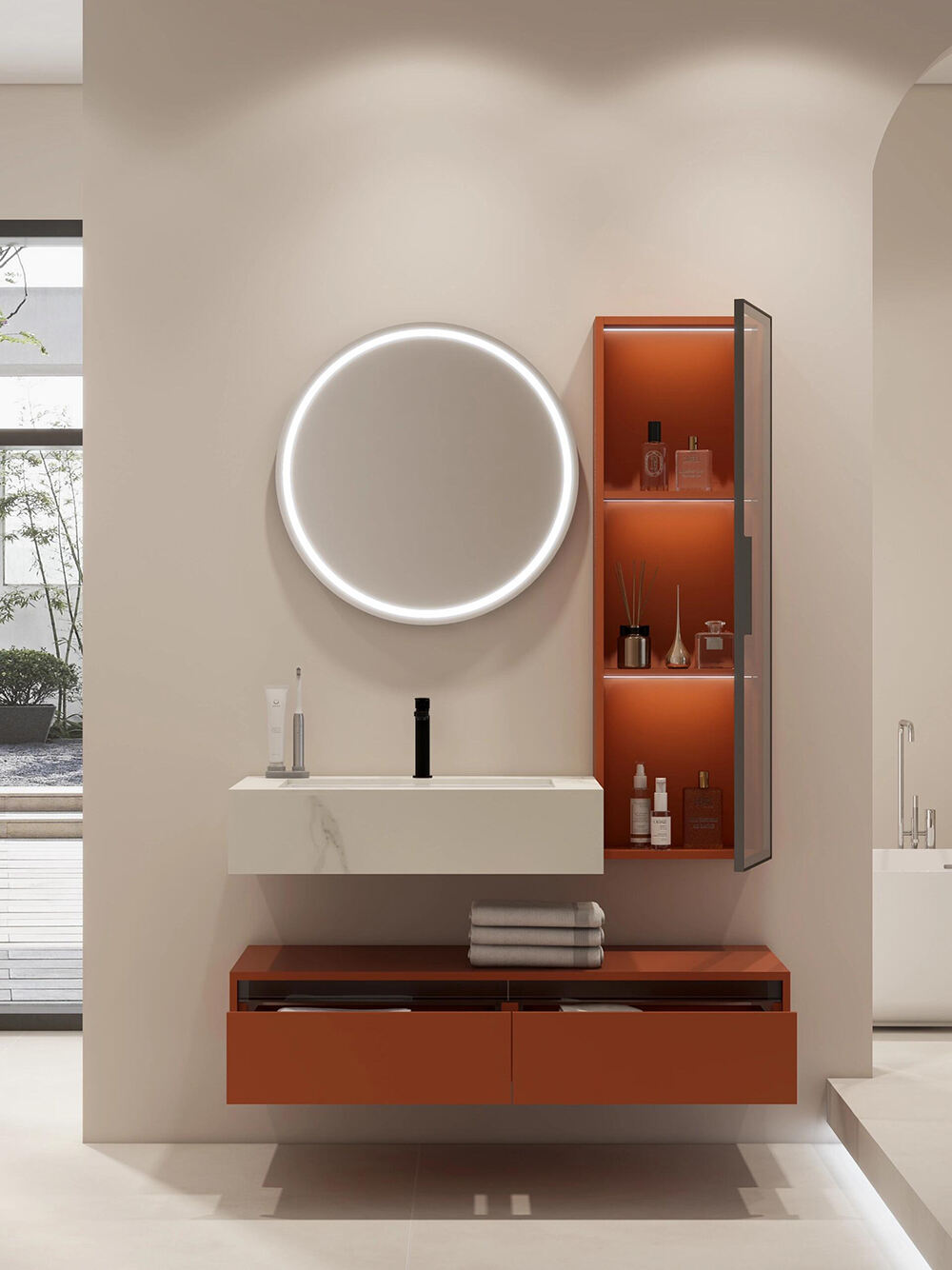 modern orange bathroom vanity set with led   lit glass cabinet circular illuminated mirror and marble   like sink for a stylish bathroom space-9