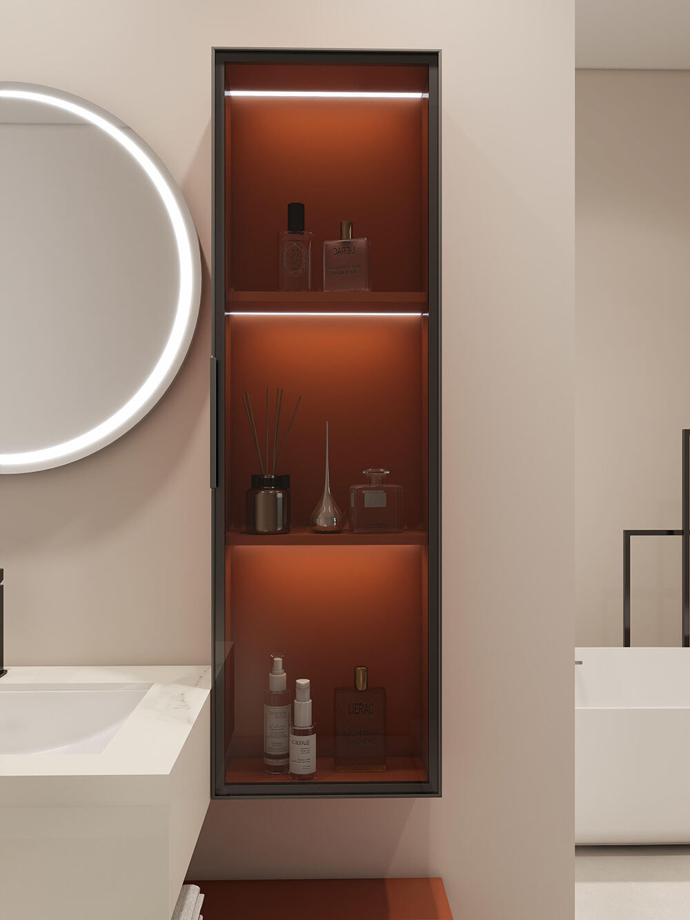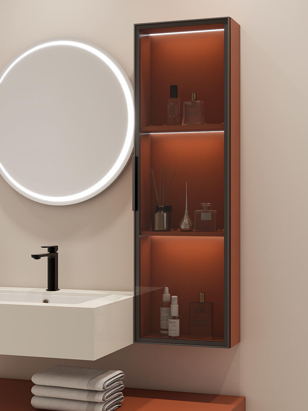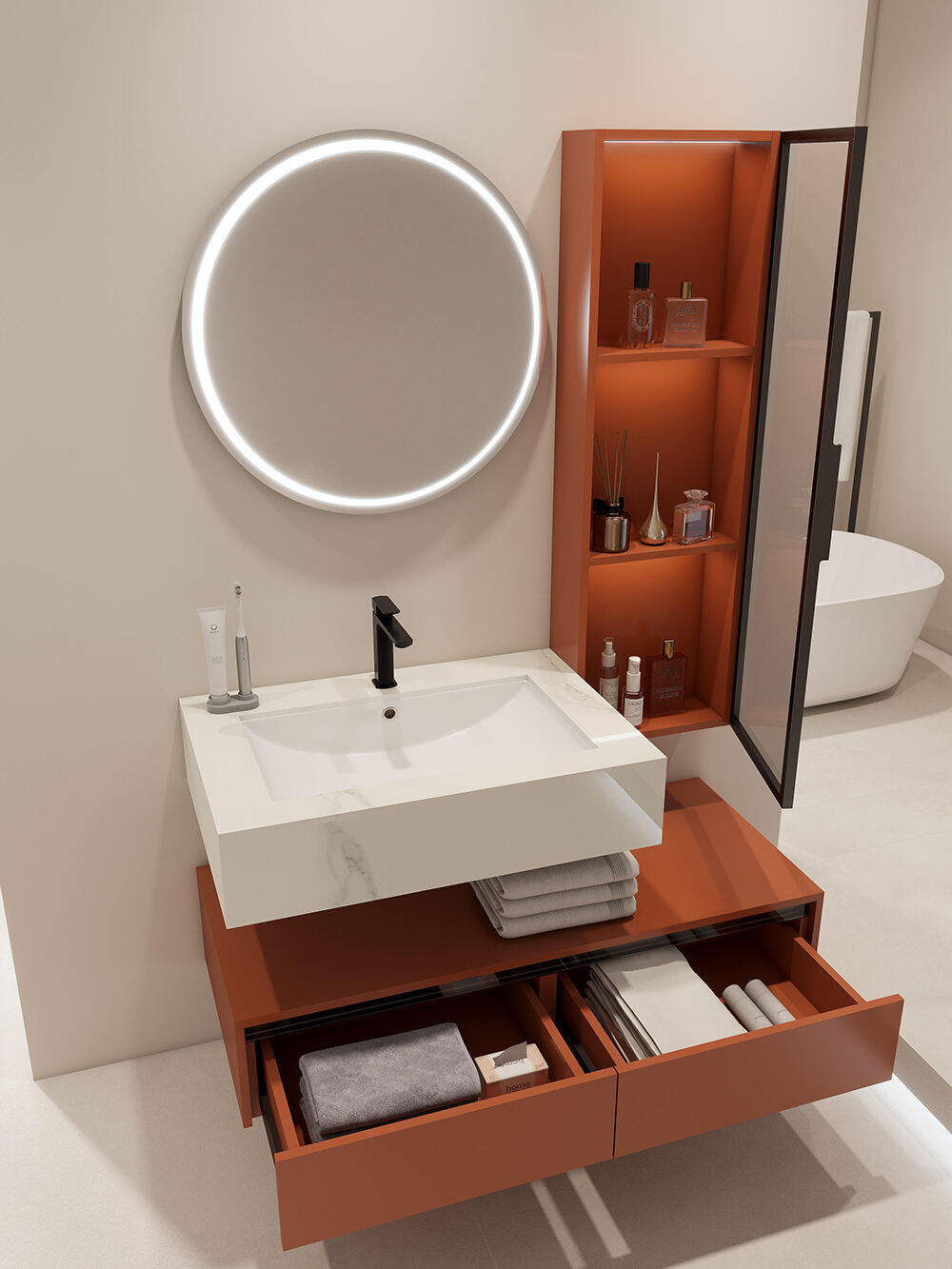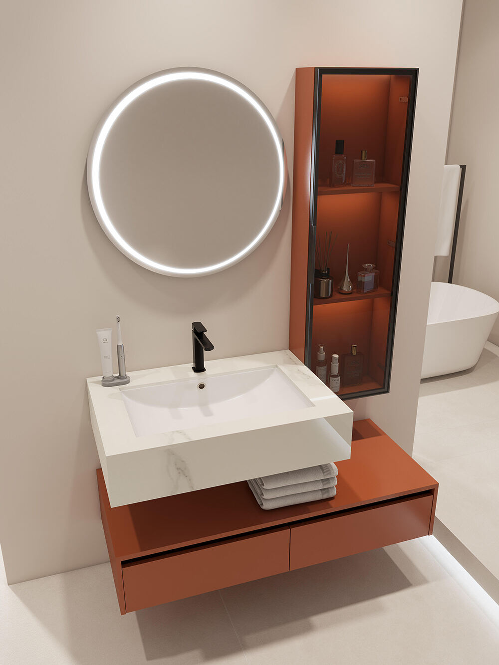 modern orange bathroom vanity set with led   lit glass cabinet circular illuminated mirror and marble   like sink for a stylish bathroom space-9