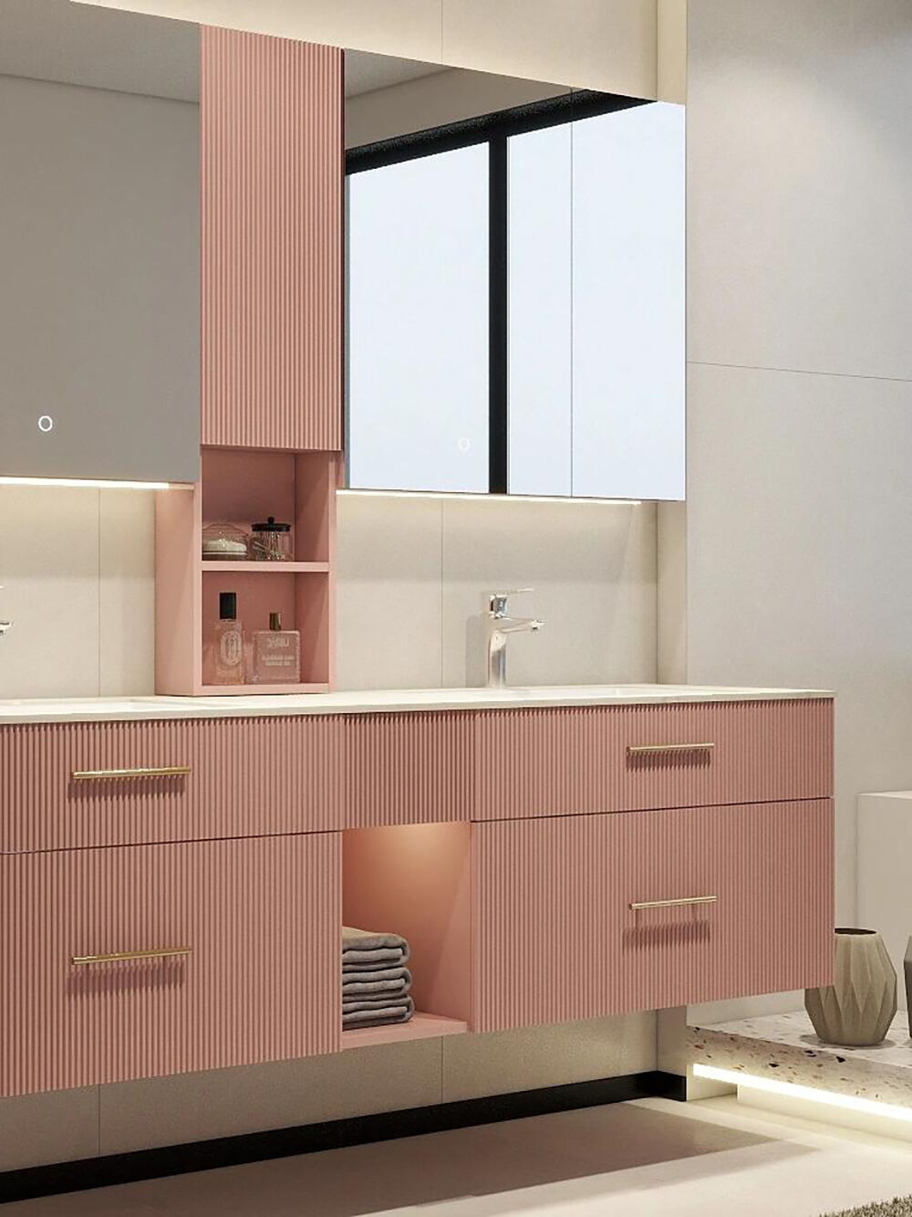Modern Pink Bathroom Vanity with Textured Finish, Double Sink, and Integrated Mirror Cabinets for a Stylish Bathroom Space
