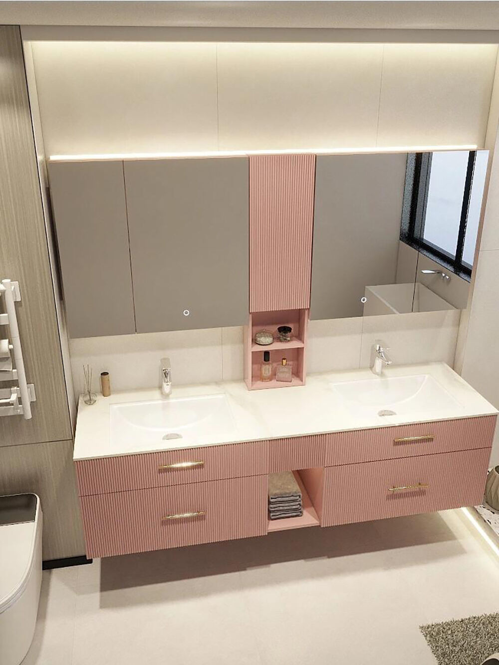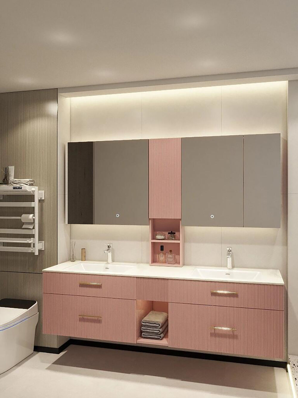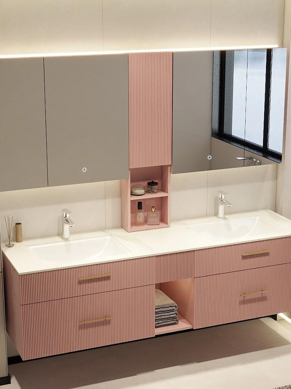 Upgrade your bathroom with this modern pink bathroom vanity, featuring a textured finish, double sink, and integrated mirror cabinets. This elegant, functional, and trendy storage solution creates a stylish bathroom space tailored to your needs.