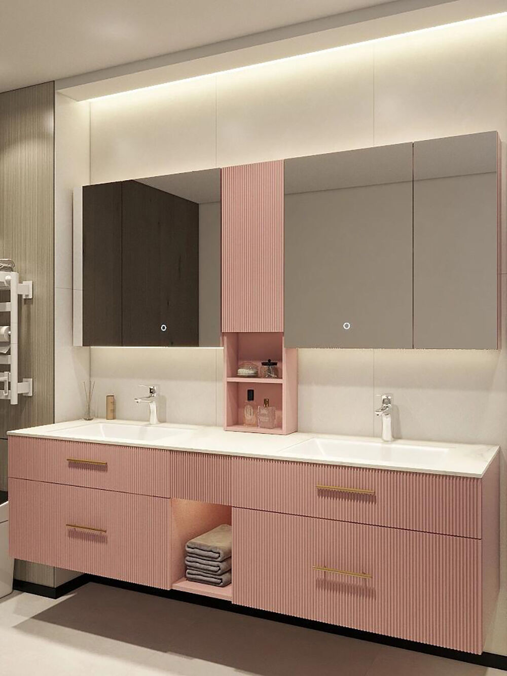 modern pink bathroom vanity with textured finish double sink and integrated mirror cabinets for a stylish bathroom space-9
