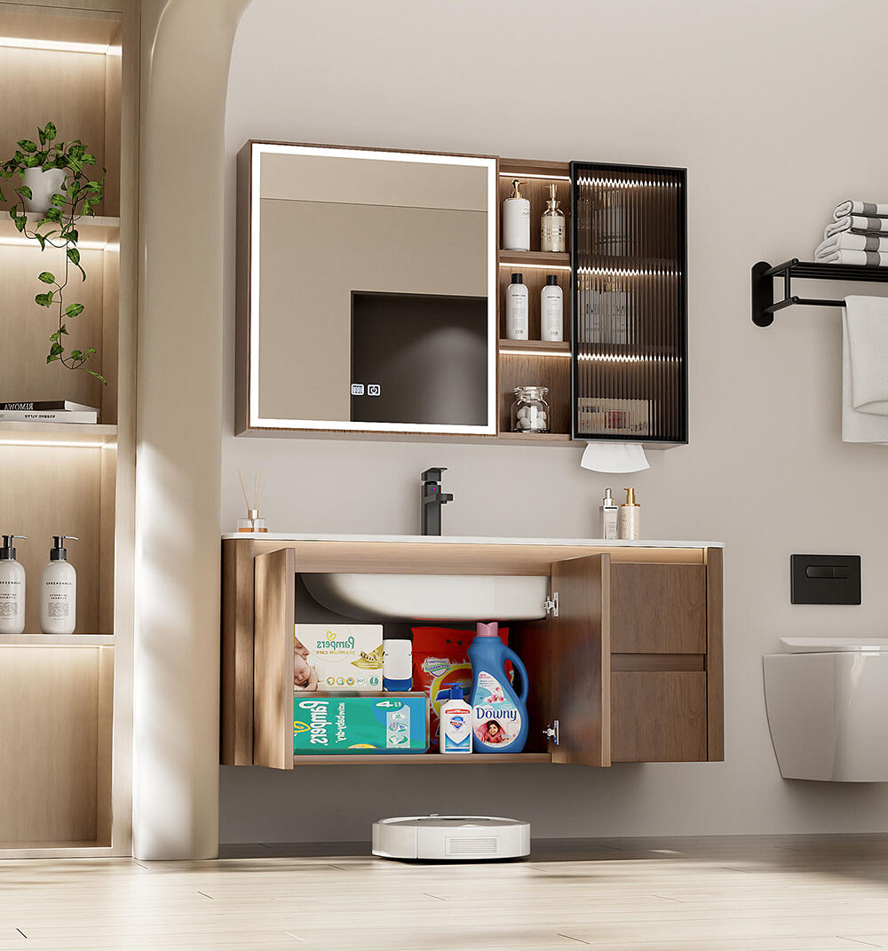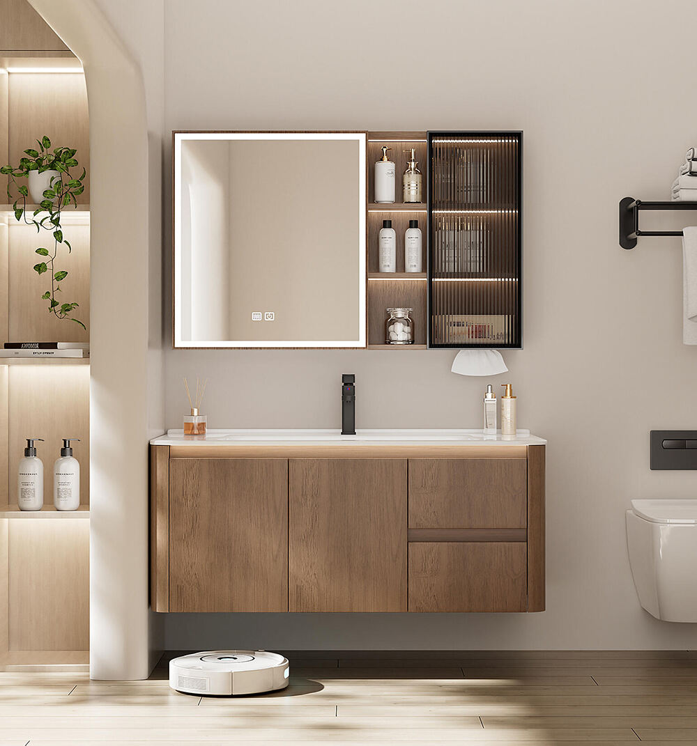 modern wood   toned bathroom vanity with led   lit smart mirror multi   storage cabinets and open shelving for a cozy bathroom space-9