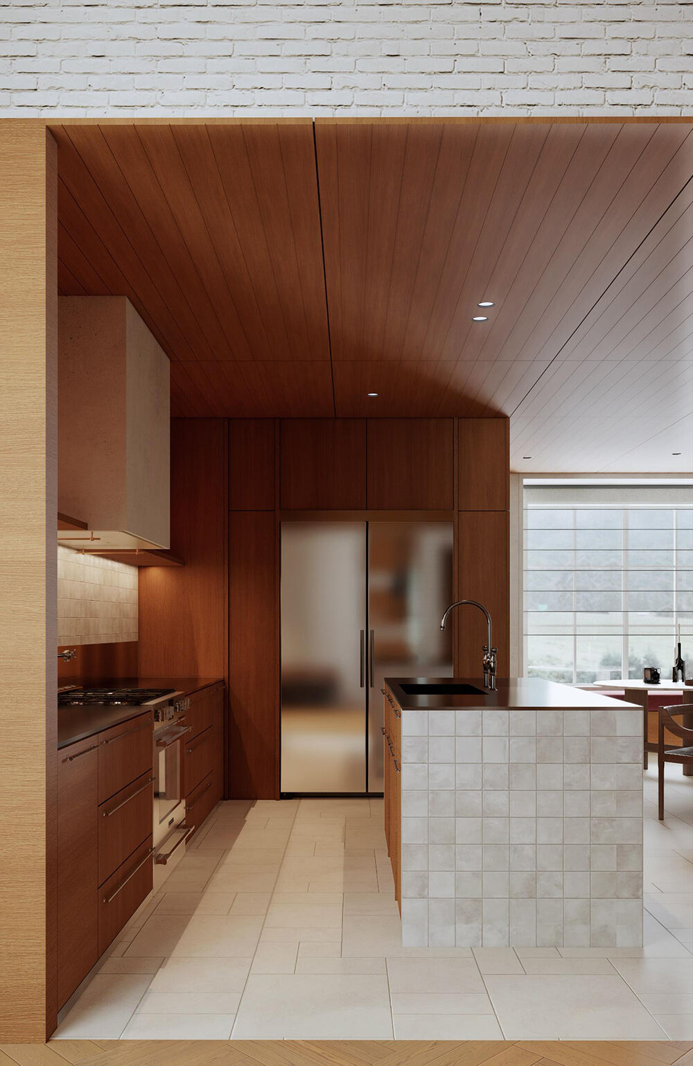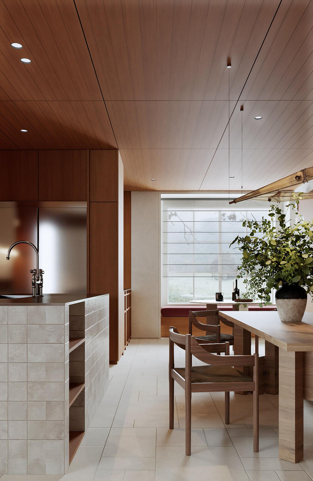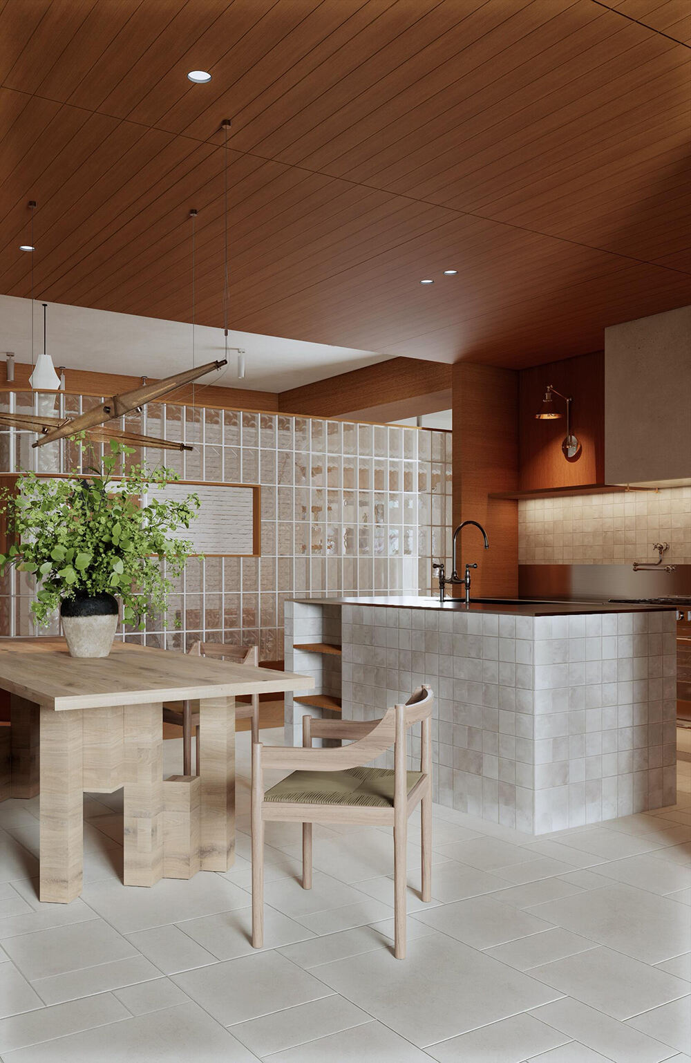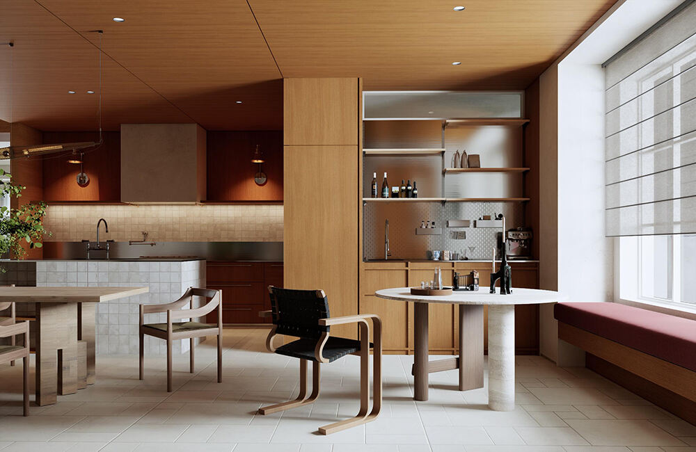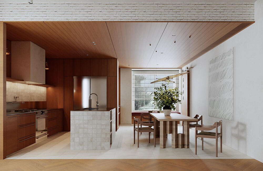 Современная кухня и обеденная зона в открытом пространстве с тёплыми древесными тонами, акцентами из стеклянных блоков и встроенным хранением для уютных интерьеров дома