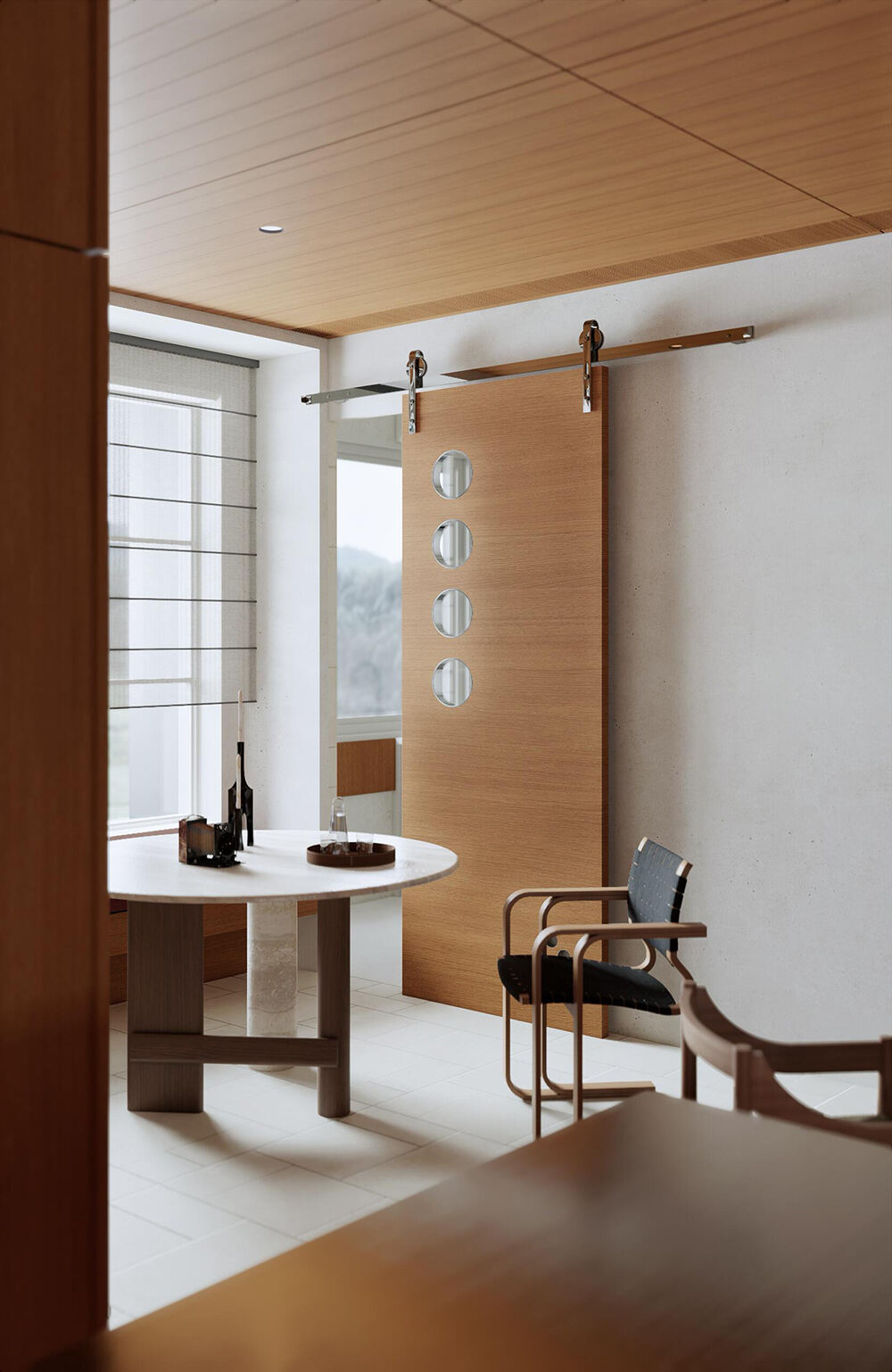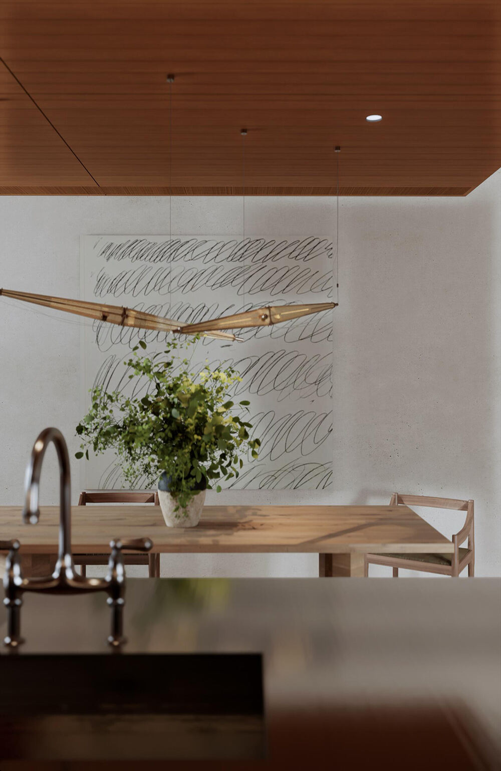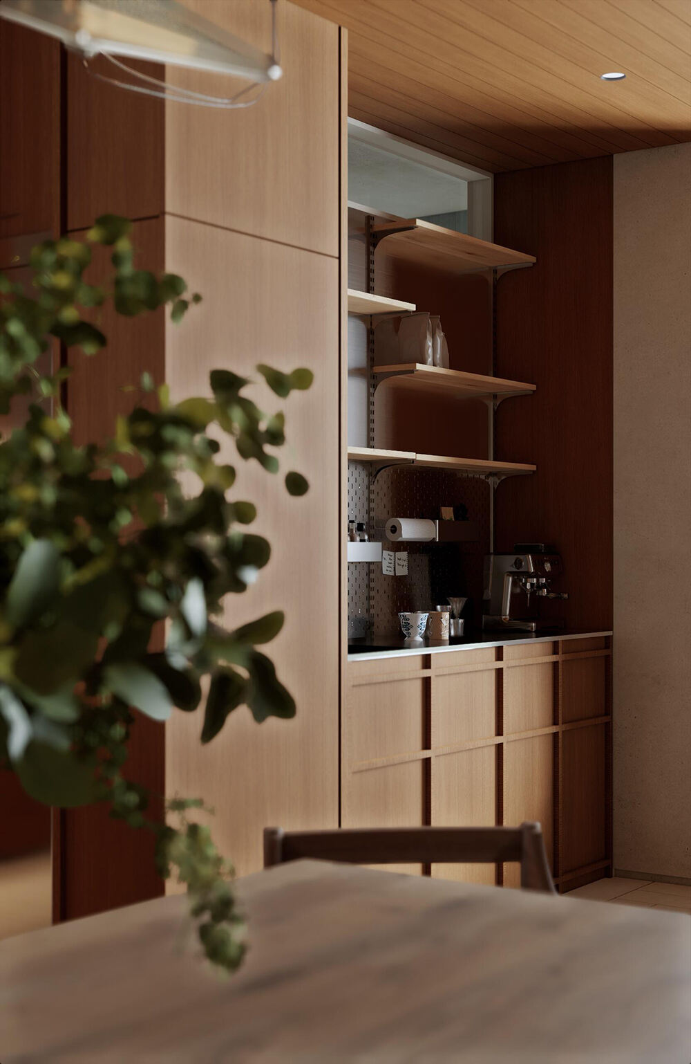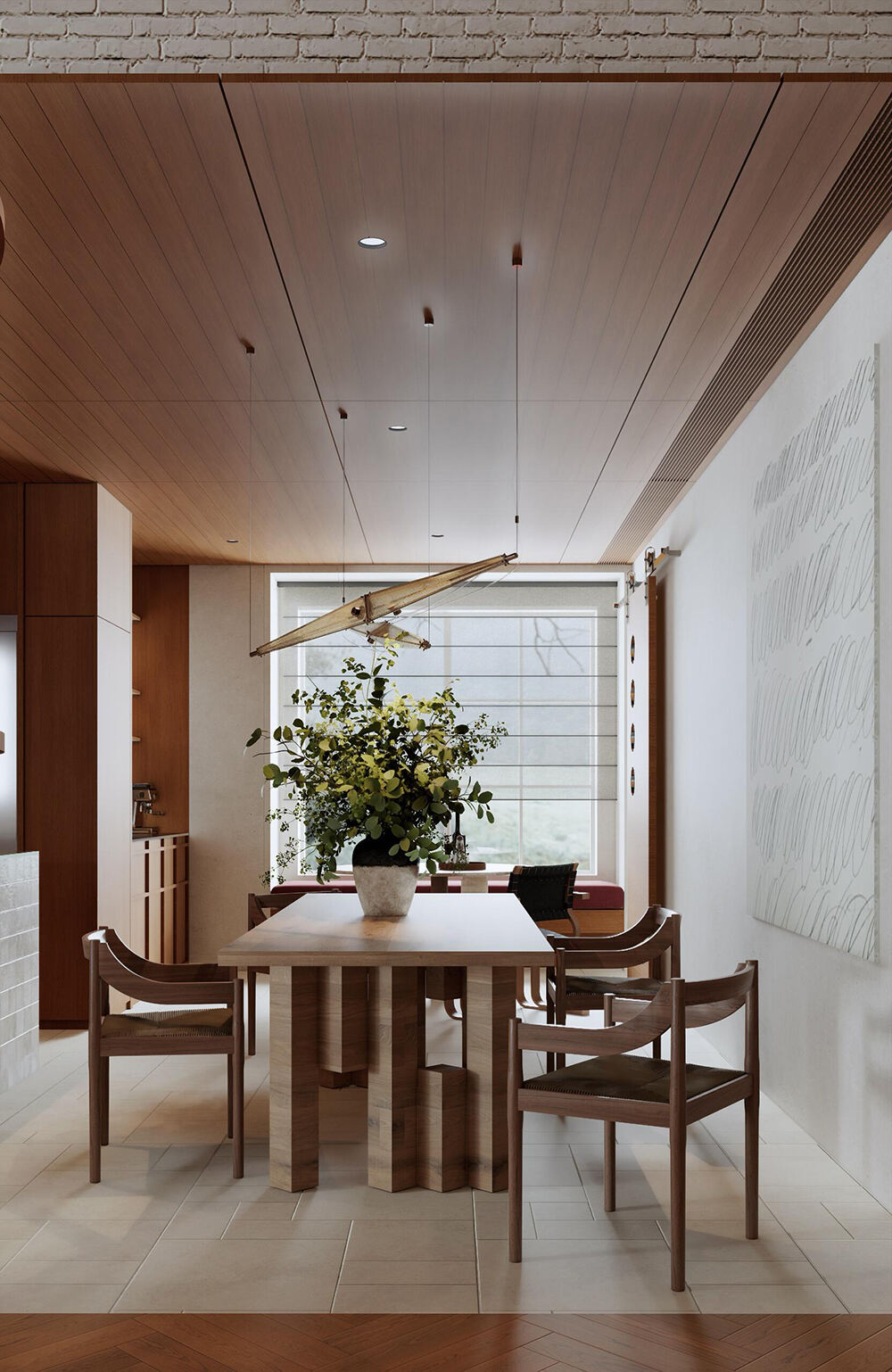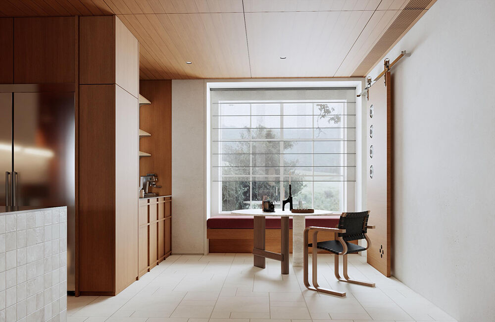 Современная кухня и обеденная зона в открытом пространстве с тёплыми древесными тонами, акцентами из стеклянных блоков и встроенным хранением для уютных интерьеров дома