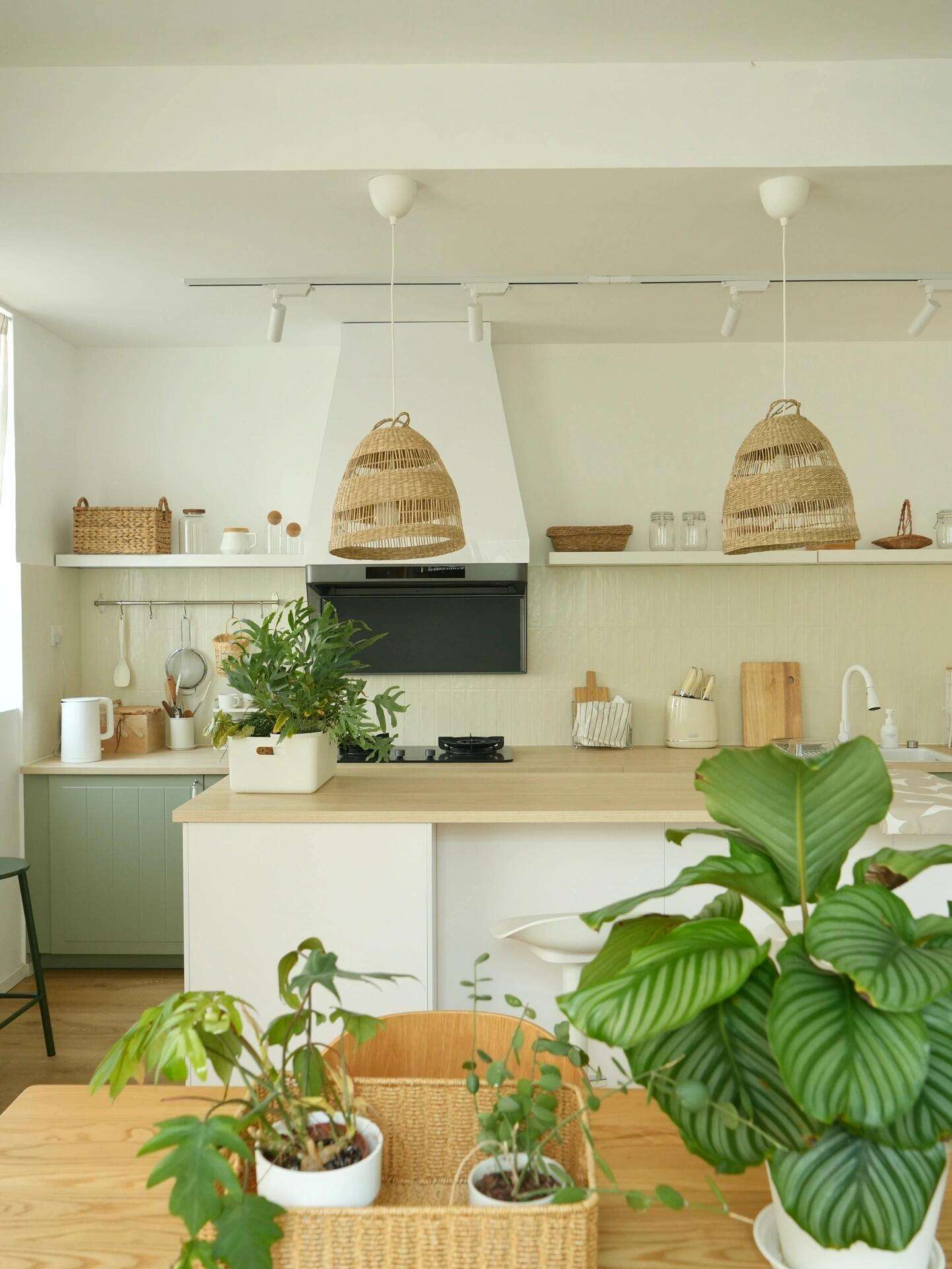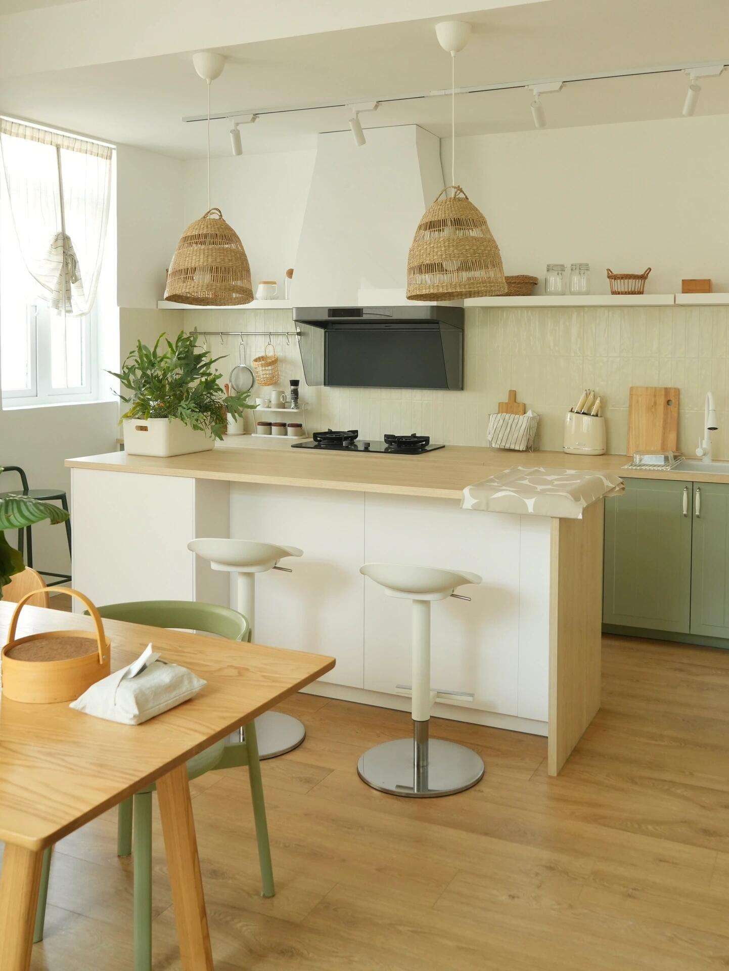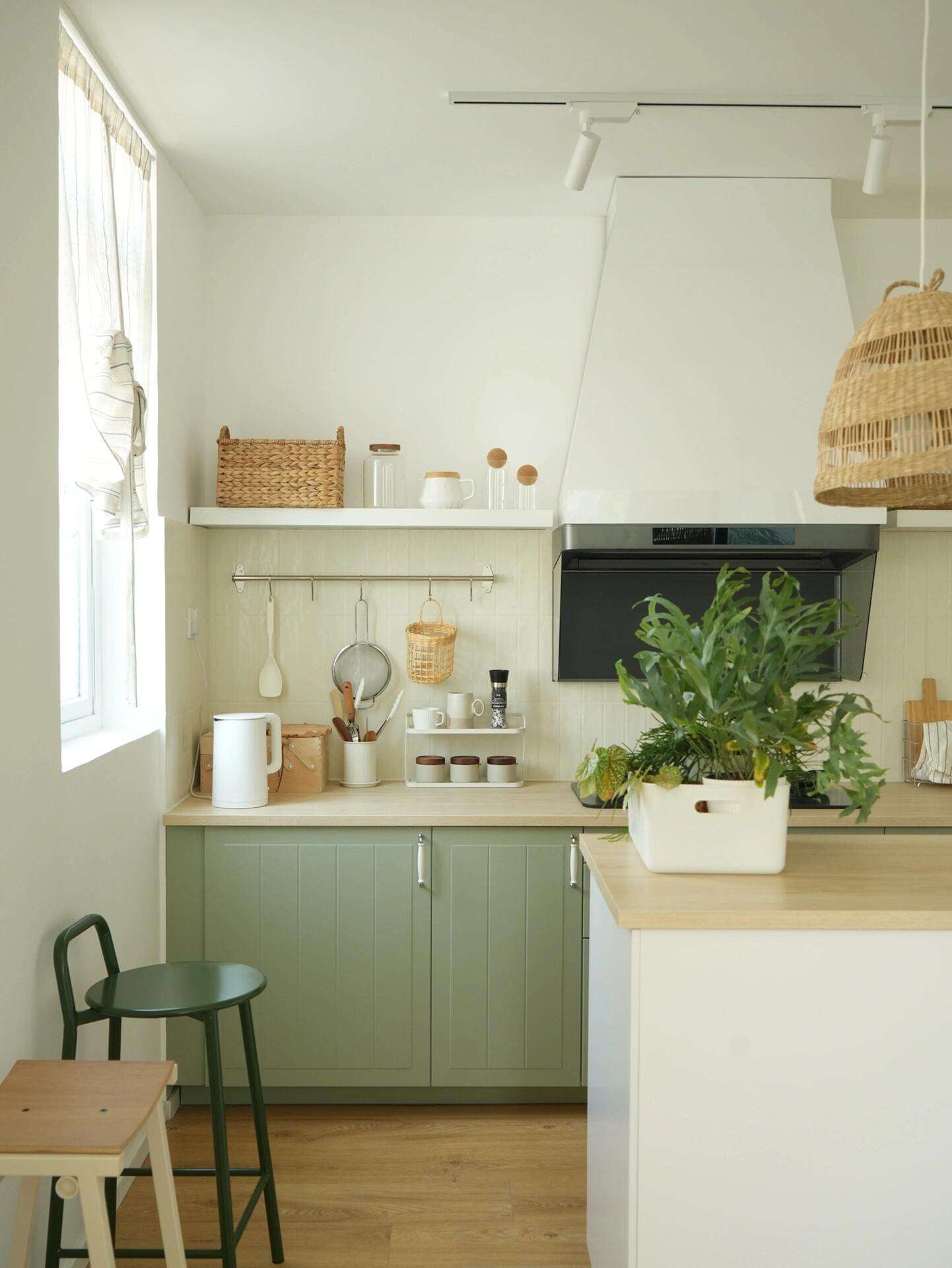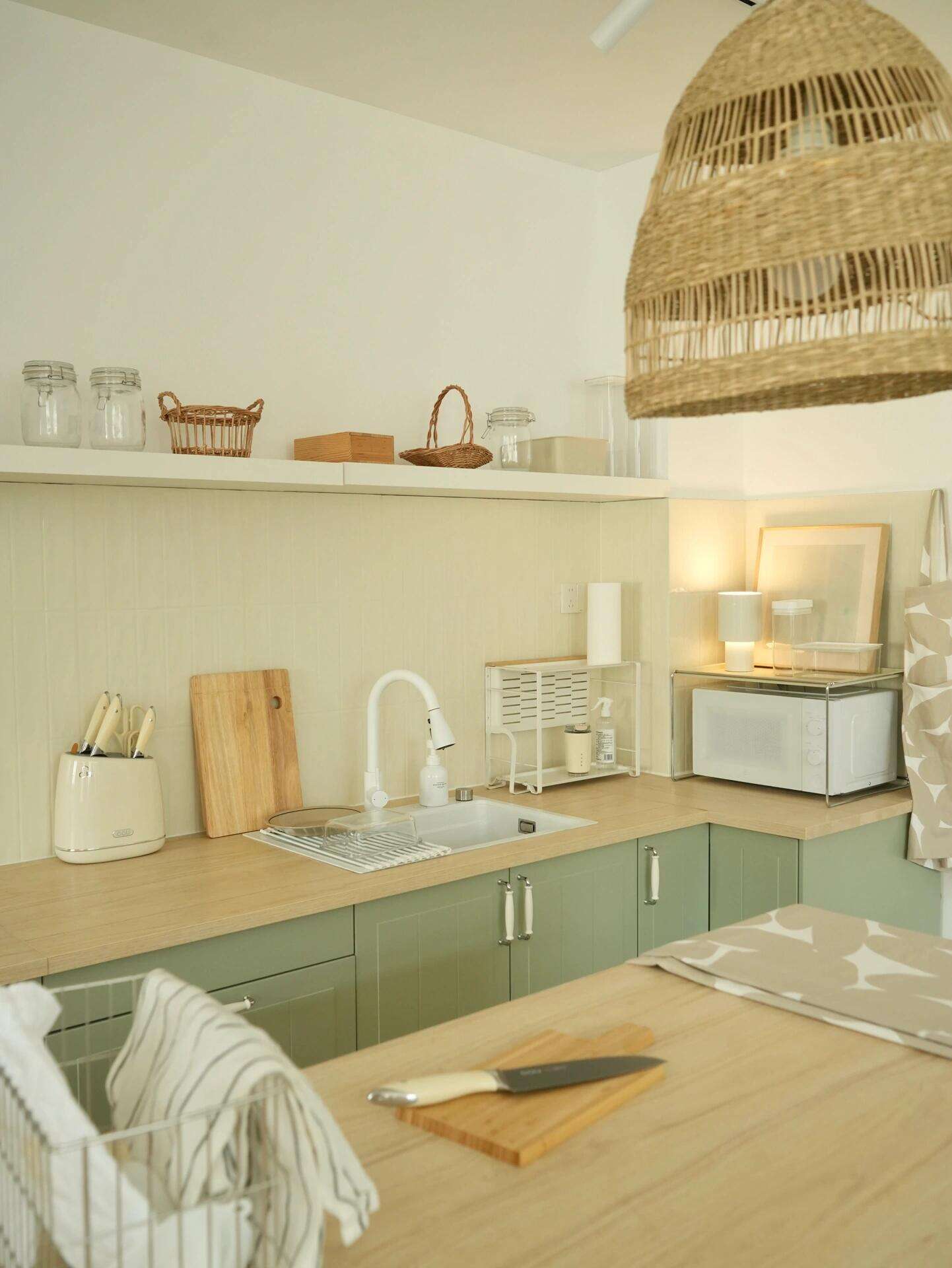 Scandinavian - Style Kitchen with Sage Green Cabinets, Light Wood Accents, and Rattan Lighting for a Cozy Home Cooking Space