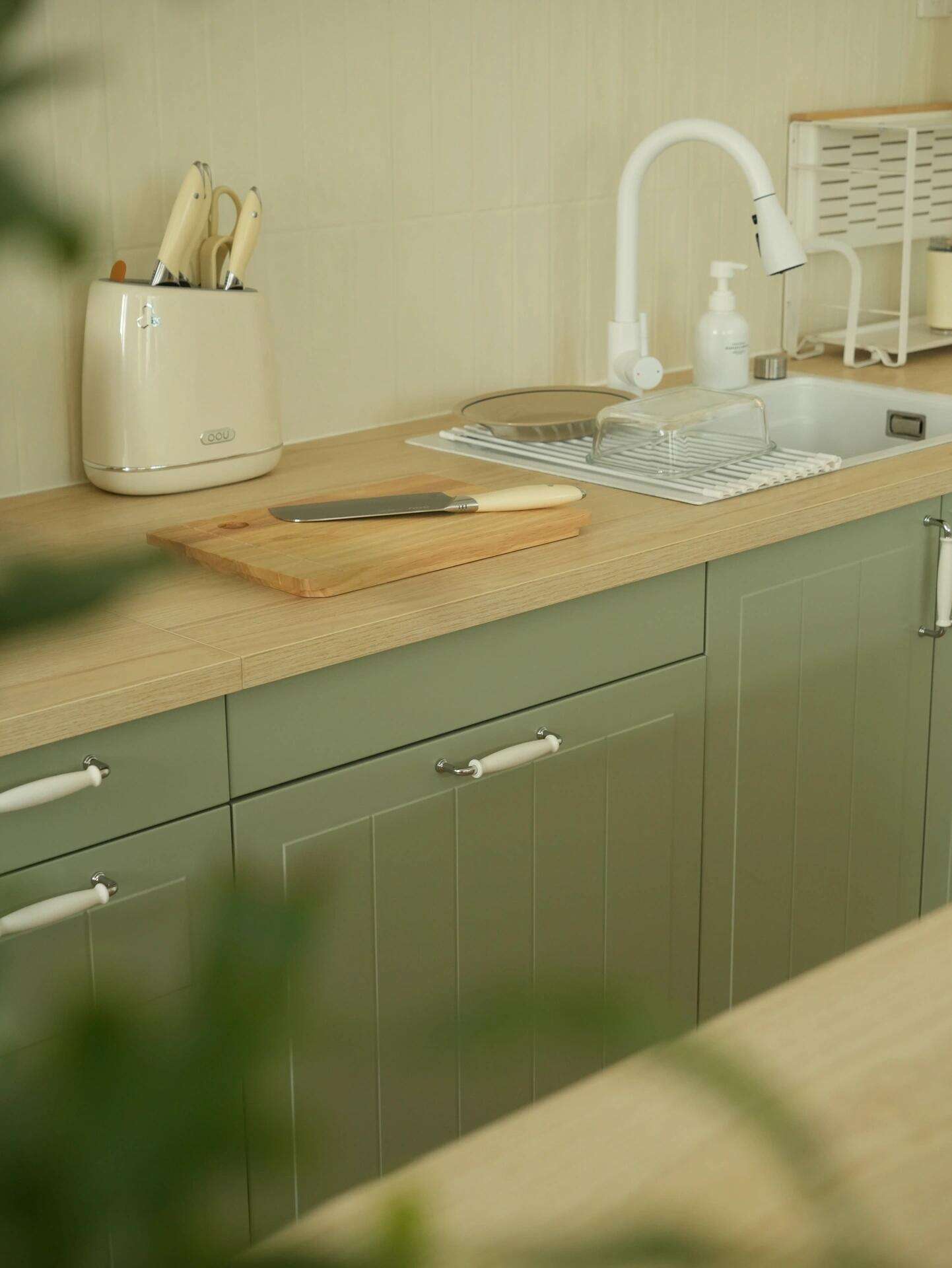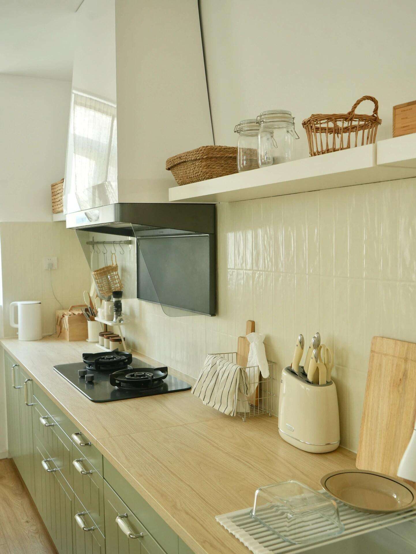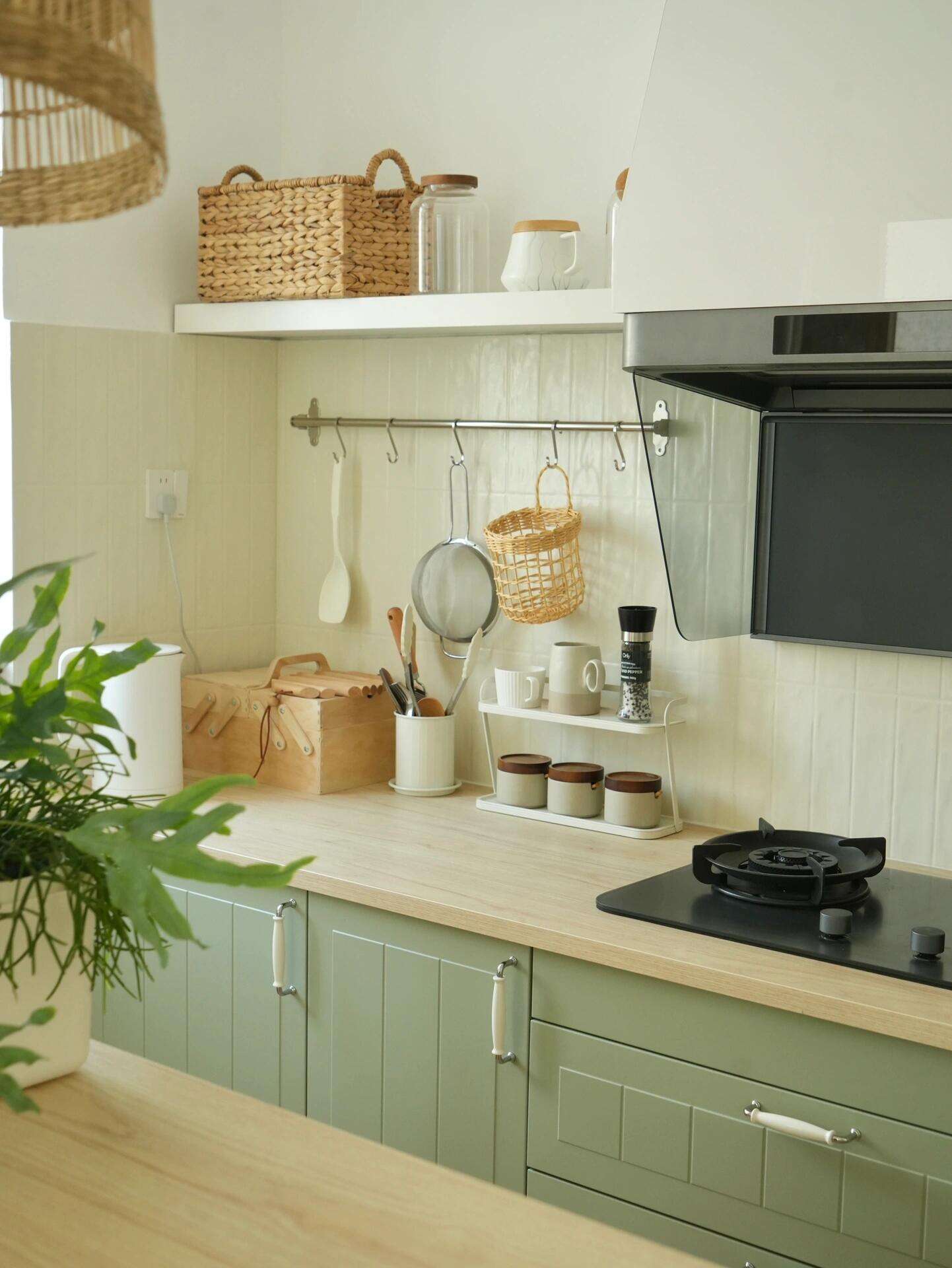 scandinavian   style kitchen with sage green cabinets light wood accents and rattan lighting for a cozy home cooking space-9