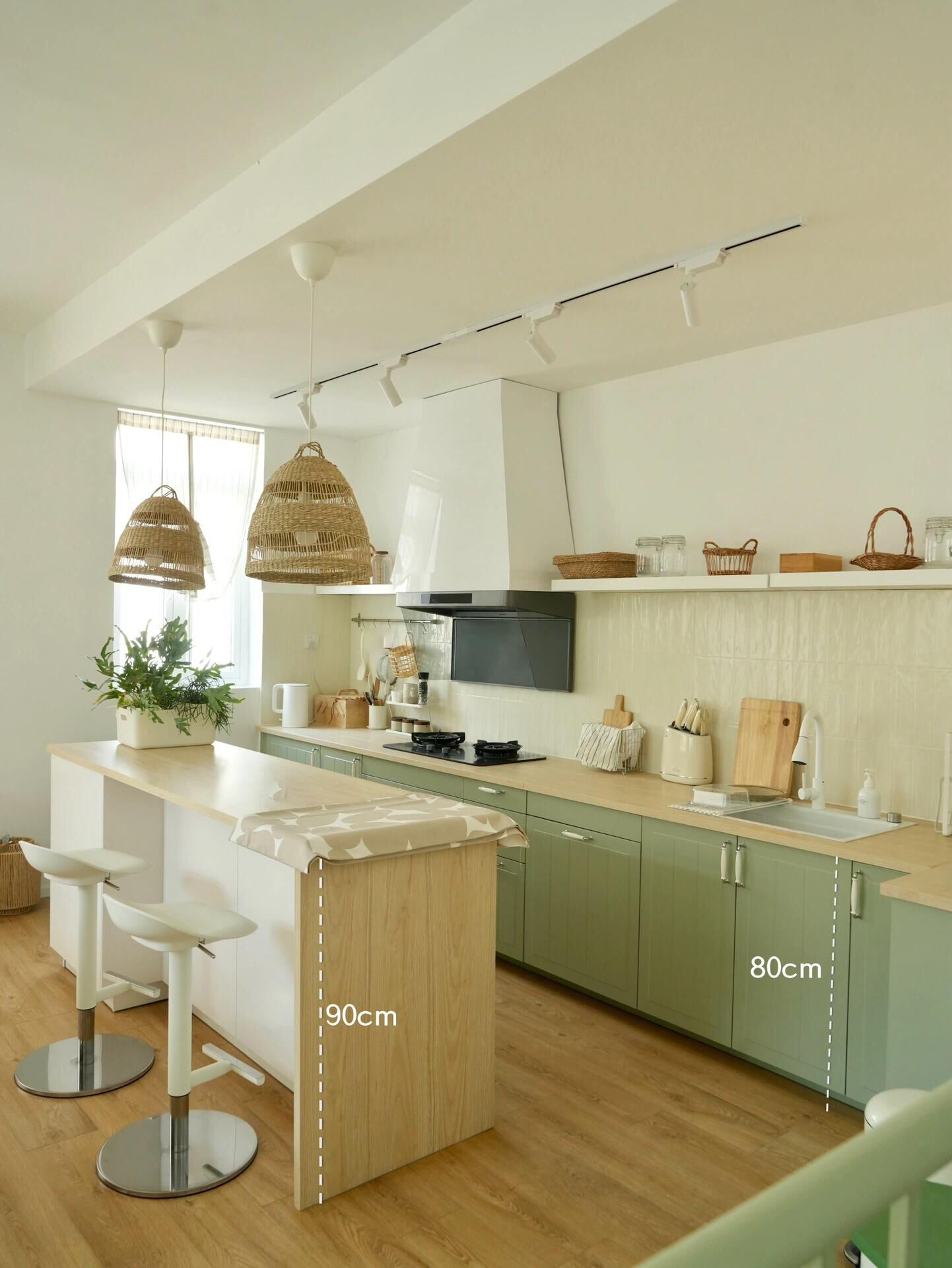 Transform your home cooking experience with this Scandinavian - style kitchen, featuring sage green cabinets, light wood accents, and rattan lighting to create a cozy and inviting space. This elegant, functional, and nature - inspired design is perfect for modern homes. The sage green cabinets bring a touch of nature and tranquility, the light wood accents add warmth and a natural feel, and the rattan lighting introduces a charming, rustic element, making the kitchen a delightful place to prepare meals and enjoy quality time with family.