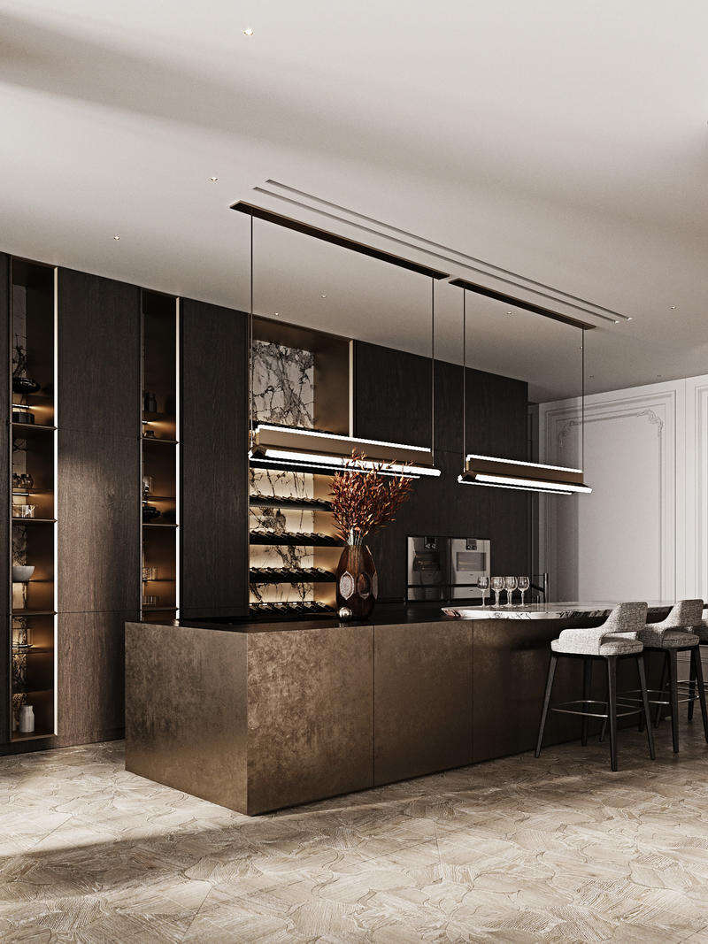 • Features: Built-in appliances (oven, fridge), wine racks, pull-out pantries