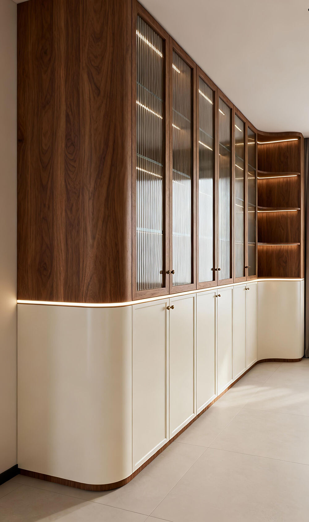 Nagbibigay ng integrated na imbakan na may mabuti nating naka-ayos na mga seksyon (para sa pagbaba, pagtiklop, at drawer) para sa lahat ng uri ng damit at aksesorya. Kasama rin dito ang open display grids na may mainit na ilaw para ipakita ang mga bagay tulad ng mga bag at palamuti.