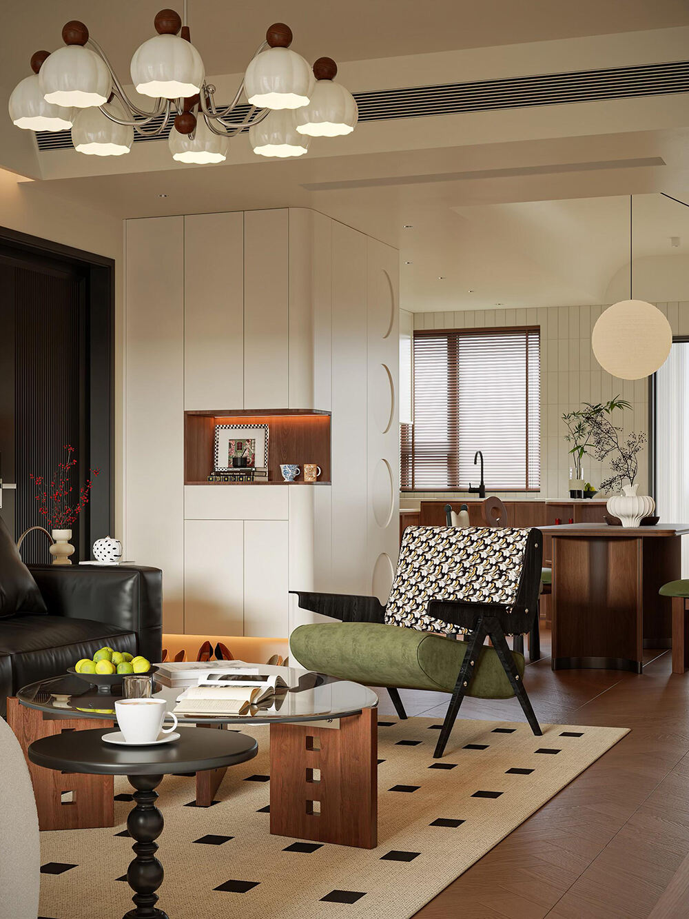 vintage   modern whole house custom furniture with warm wood tones playful shapes and seamless integration for a cozy home space-1